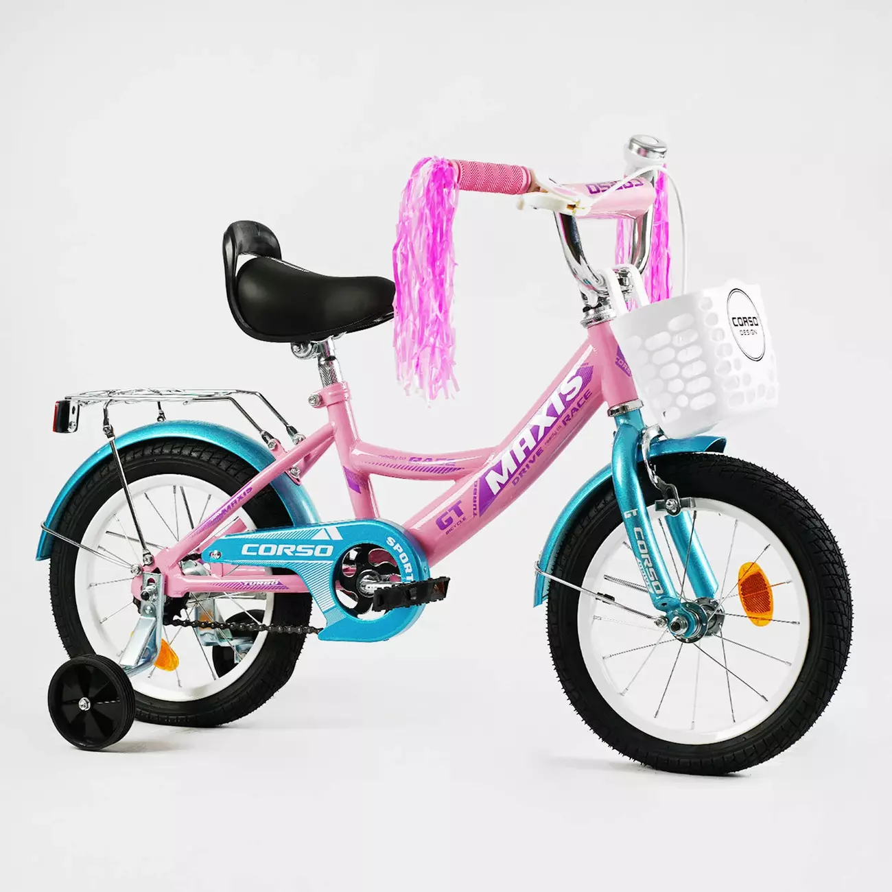 Велосипед 14" дюймів 2-х колісний "CORSO" MAXIS CL-14287 (1) кошик, ручне гальмо, дзвіночок, сидіння з ручкою, дод.колеса, ЗІБРАНИЙ НА 75%, в коробці
