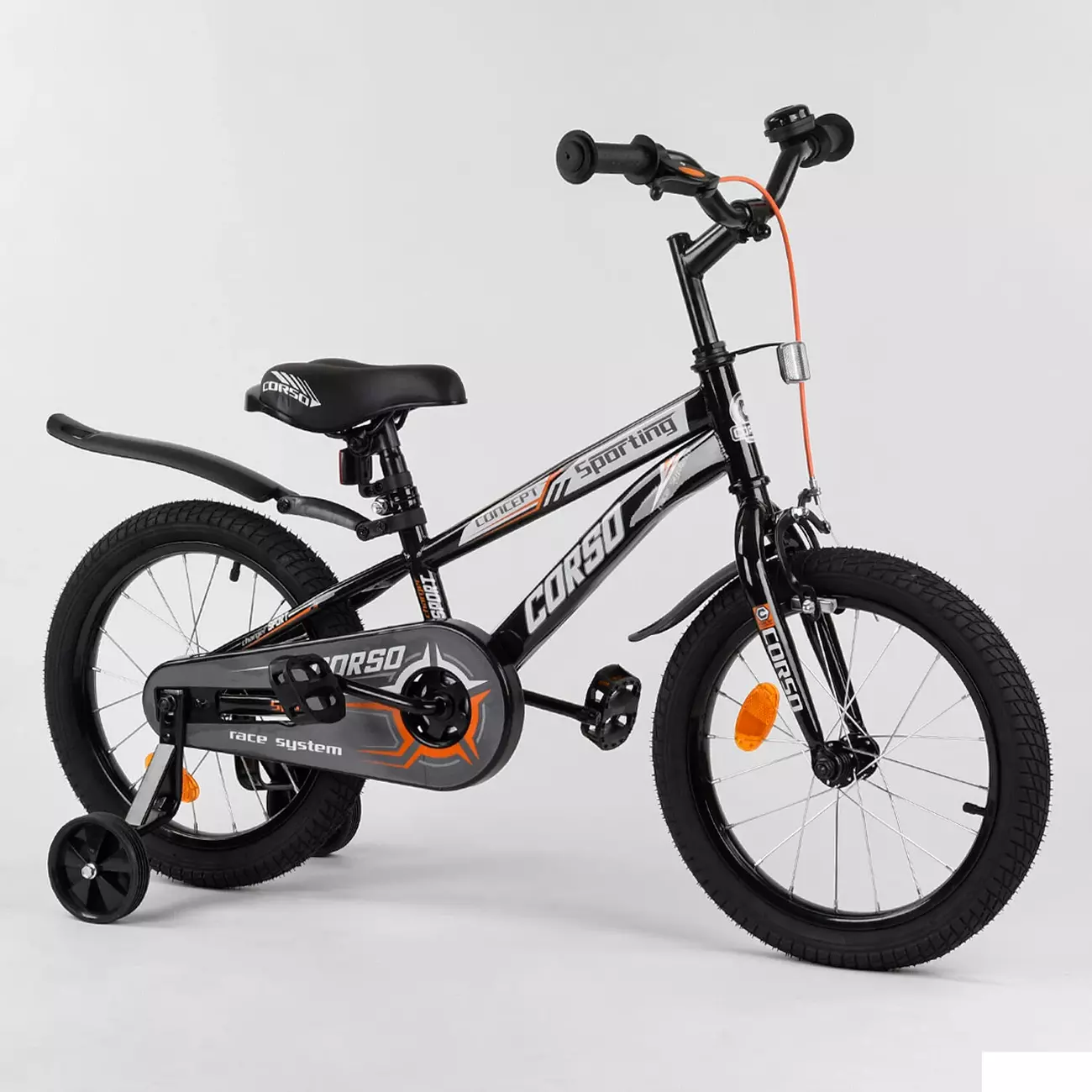 Дитячий двоколісний велосипед Corso 16`` призначений для юних велосипедистів! Нова спортивна рама велосипеда, новий дизайн, його комплектація та надійна конструкція зроблять прогулянки на свіжому повітрі активними та безпечними. Конструкція велосипеда виконана з сталевого міцного сплаву, який не дасть його рамі деформуватися і забезпечить її стійкістю до пошкоджень. Спортивна рама представленої моделі із заниженою конструкцією, що робить її зручнішою для дитини. Маля без проблем зможе сісти на велосипед і встати з нього. Колеса Corso 16” із надувною камерою на металевих дисках зі спицями. Над кожним колесом встановлені крила із пластику. Вони запобігають розбризкуванню бруду та води та захистять дитину та сам велосипед від забруднень. Кермо та сидіння велосипеда регулюється по висоті, що дасть можливість підібрати оптимальний розмір для кожної дитини індивідуально. Ручки керма з гумовими накладками, що не ковзають. Спеціально для невпевнених велосипедистів дана модель комплектується двома знімними колесами страхування з пластику і невеликою батьківською ручкою на сидінні. Додатково велосипед обладнаний механічним дзвінком на кермі. Характеристики: - Вік: 5-6 років, зріст: 110-115 см; - Діаметр коліс: 16”; - Каретка: American (Американка); - велосипед зібраний на 75%; Вага велосипеда із коробкою: 10 кг.