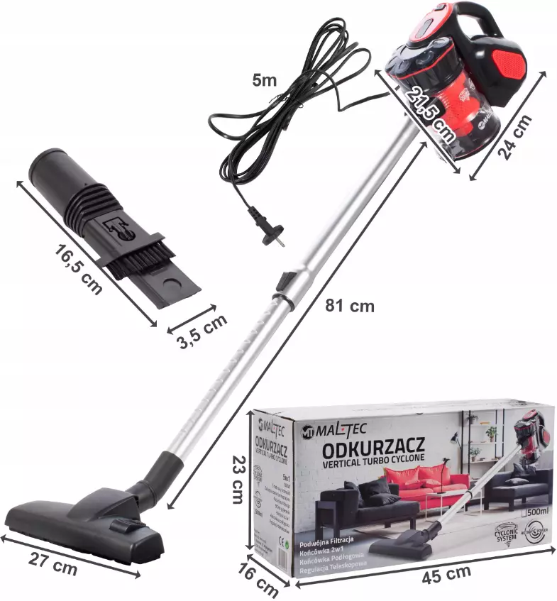 Благодаря длинному шнуру и телескопической трубке пылесос имеет большой радиус действия, что позволяет пылесосить большую площадь.