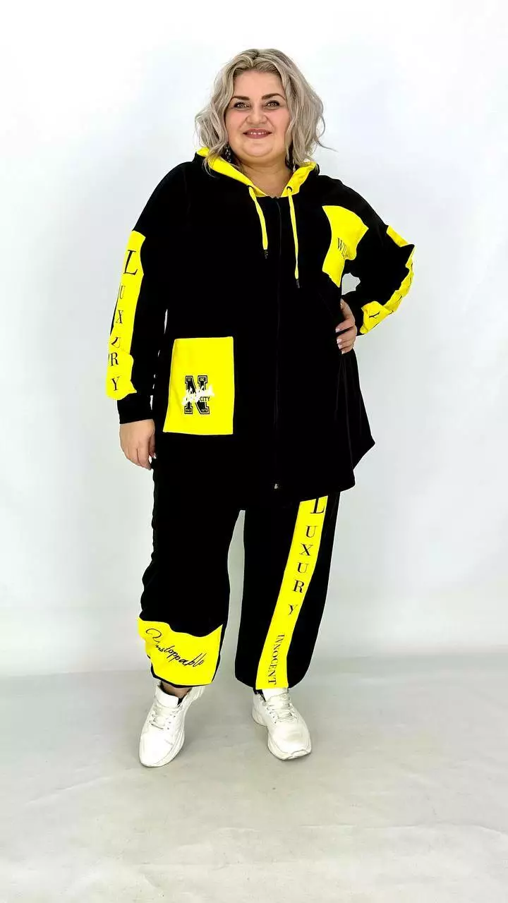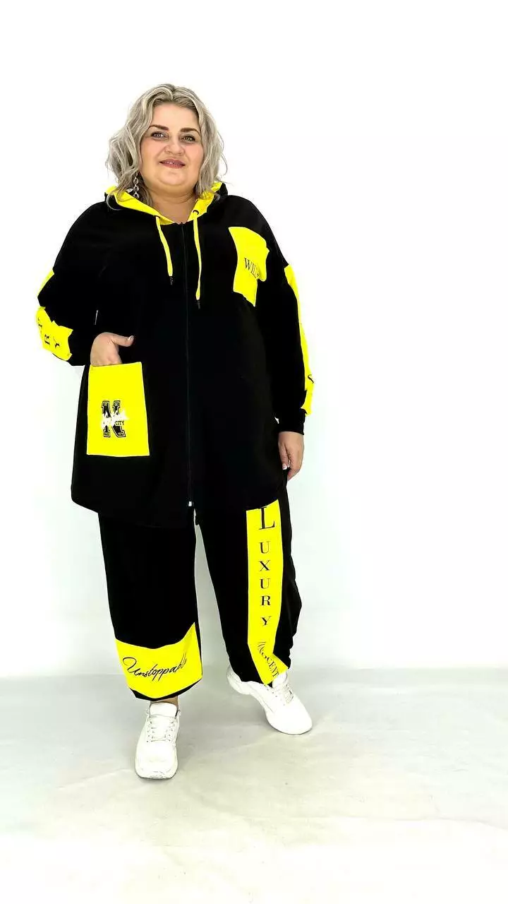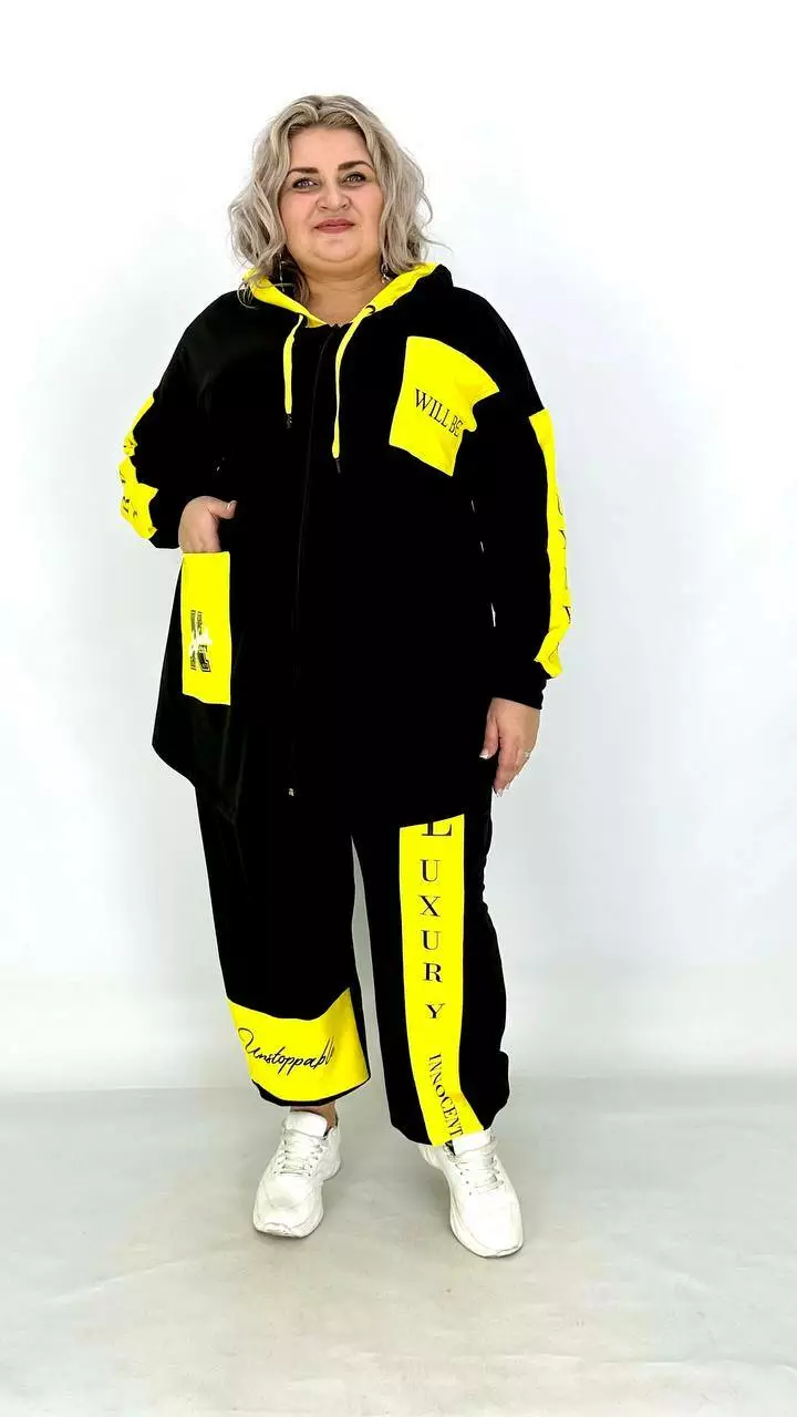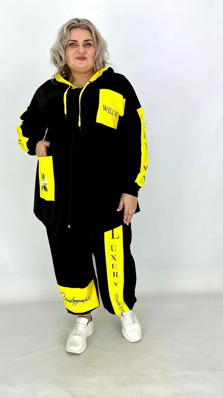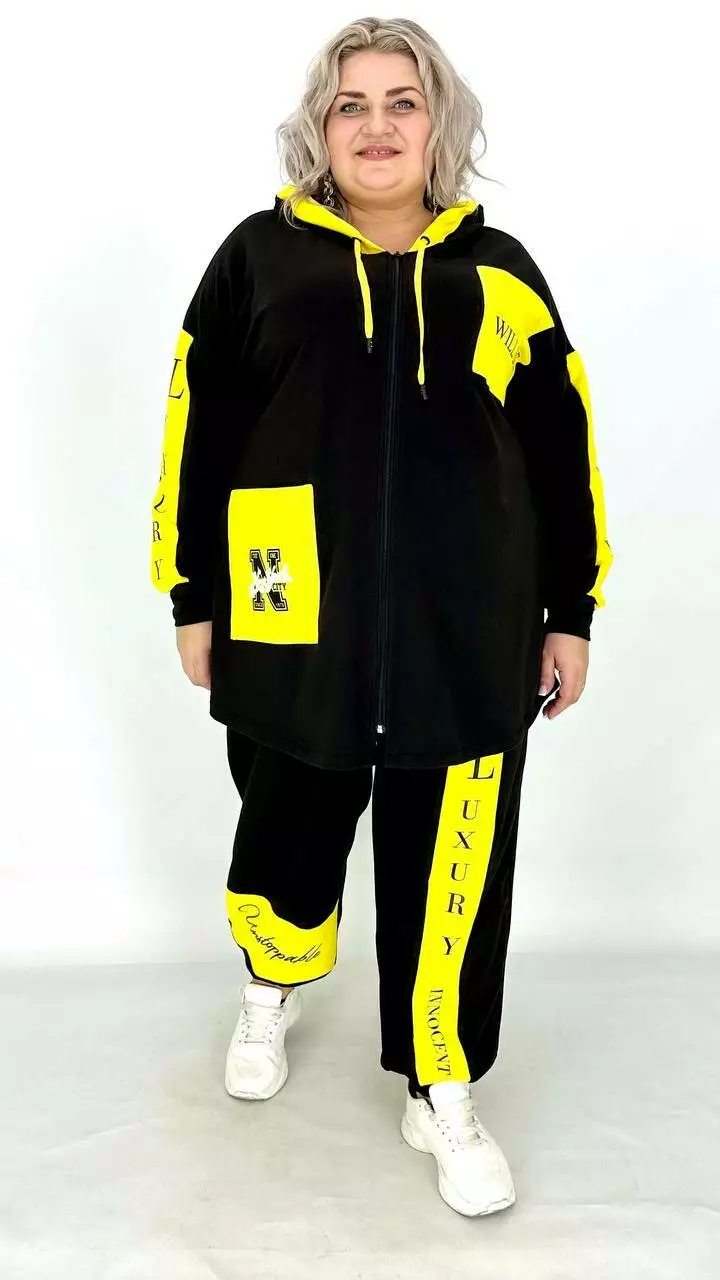 Вільний костюм оверсайз із широкими брюками на манжеті з двонитки. Тканина трикотаж з гарною розтяжністю, м'яка та приємна до тіла, не помається. Кофта з капюшоном на змійці, спущене плече, рукав на манжеті, кишені у бічних швах. Штани-широкі, пояс на резинці з кишенями.