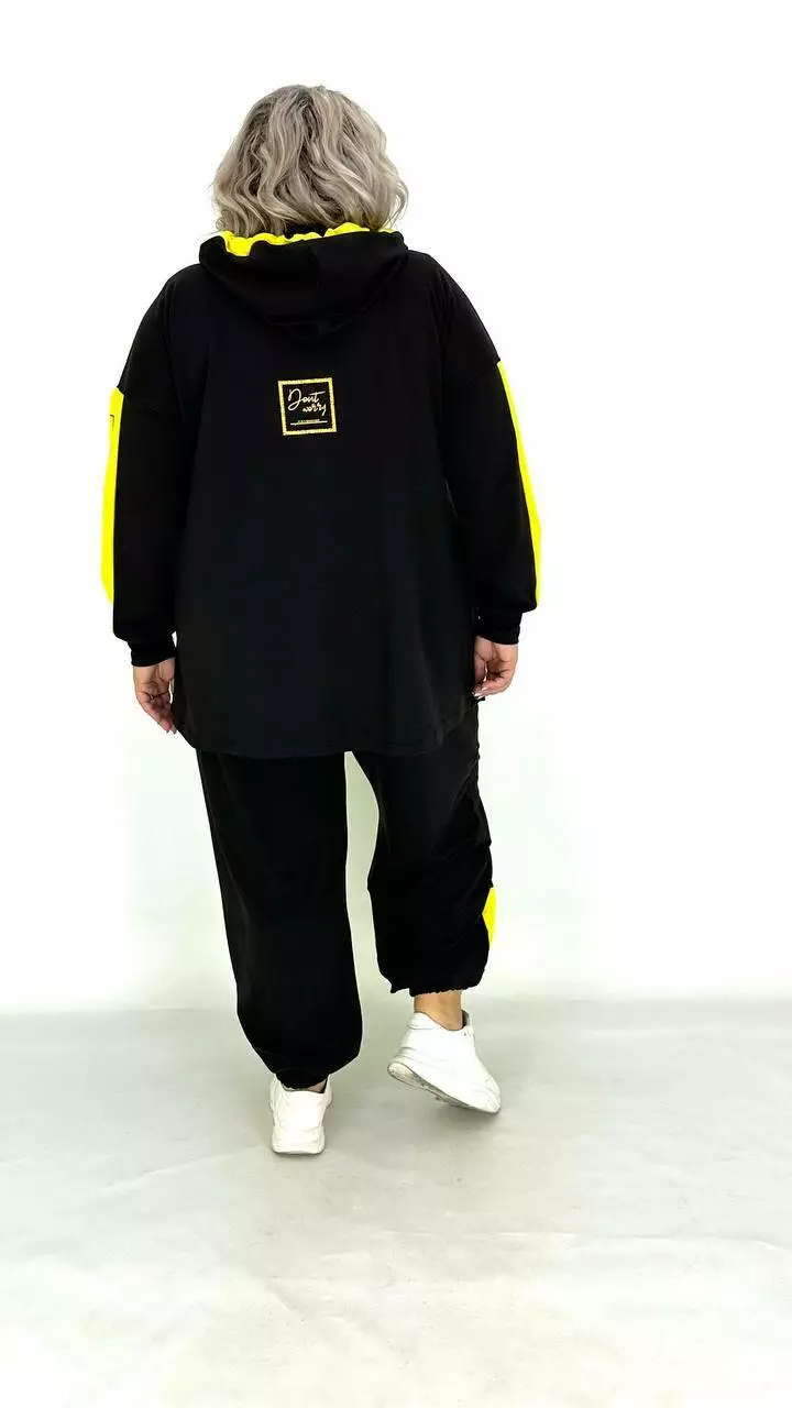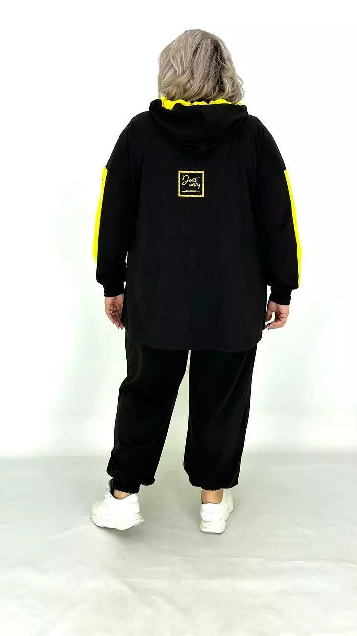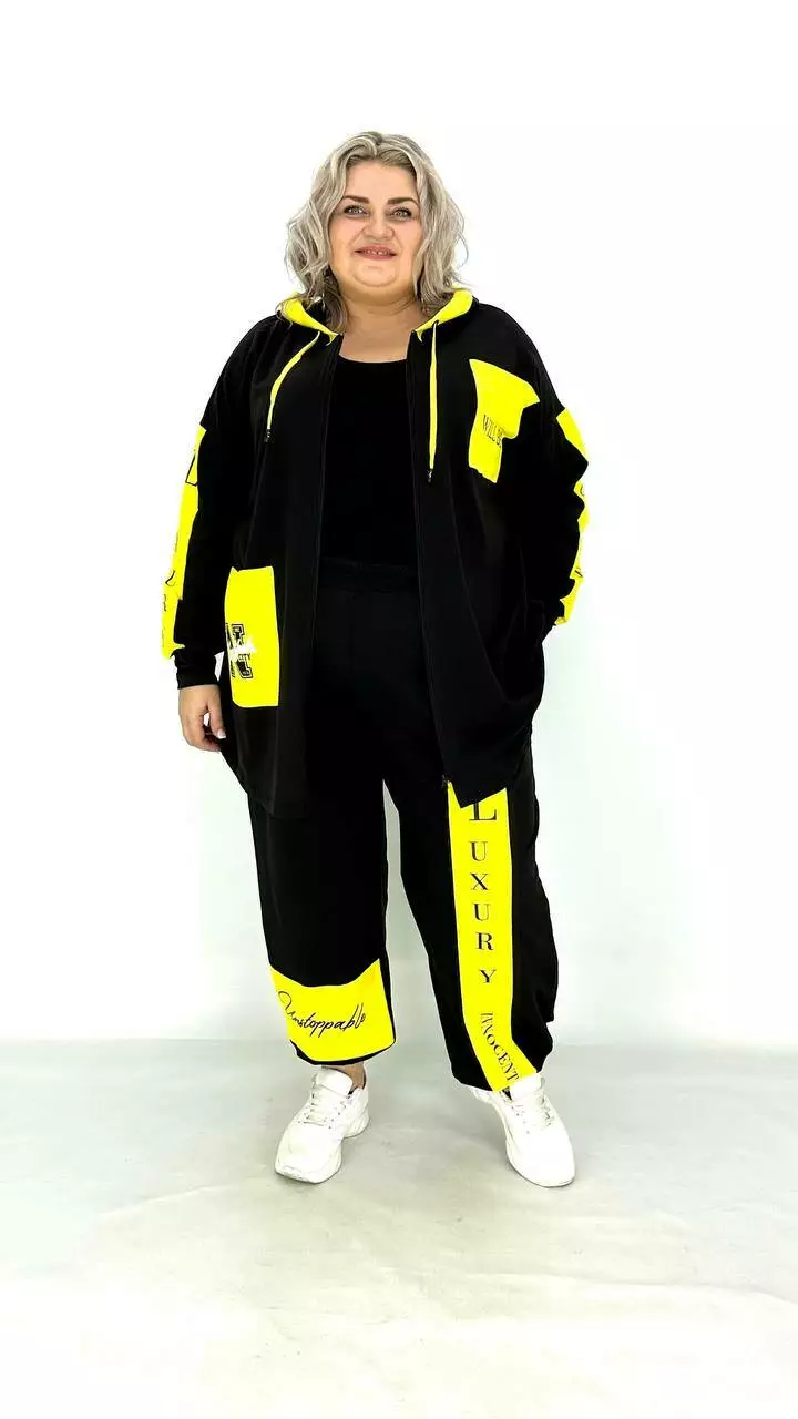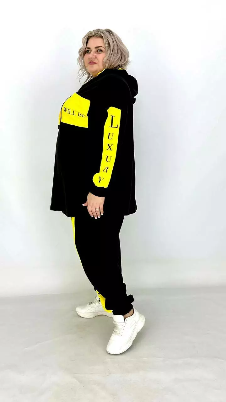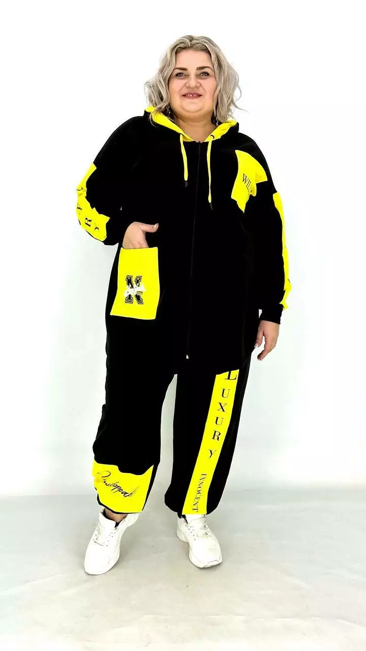 Вільний костюм оверсайз із широкими брюками на манжеті з двонитки. Тканина трикотаж з гарною розтяжністю, м'яка та приємна до тіла, не помається. Кофта з капюшоном на змійці, спущене плече, рукав на манжеті, кишені у бічних швах. Штани-широкі, пояс на резинці з кишенями.