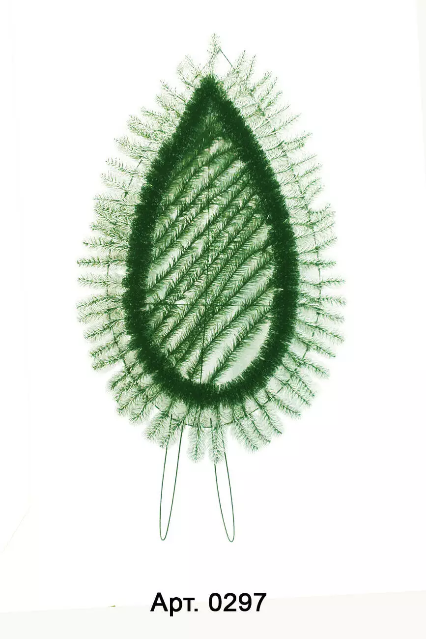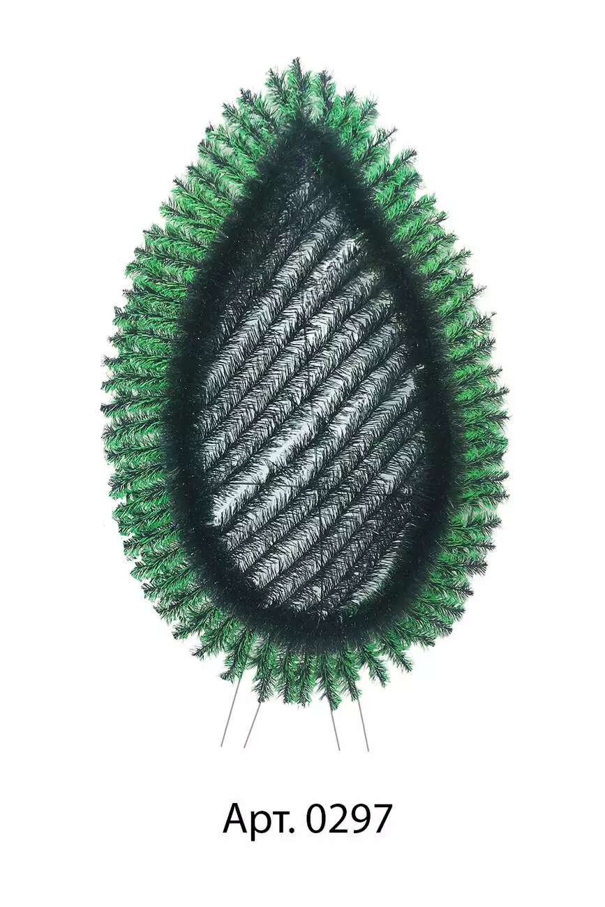 Вінок зі штучної хвої, зашитий по центру по діагоналі, з йоршом. Вінок заплетений по краю відрізками двокольорової хвої. Розмір 164*85*18 см.