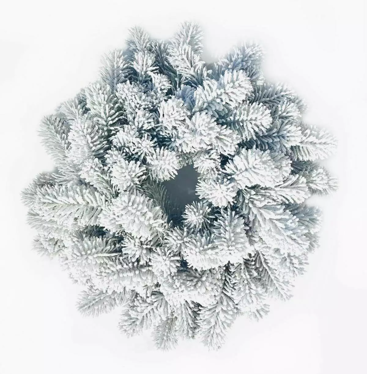 Новорічний декоративний вінок діаметром 45 см являє собою переплетені гілки штучної ялинки. Без декора. Виготовлений з 100% литої хвої. Голочки як у живої ялинки, але м'які і не колючі. Об'ємне густе напилення на вінку, реалістично імітує сніг, який тільки що впав на гілки пухнастими пластівцями. Матеріалом розпилення є натуральна бавовна, він екологічний і не має запаху, безпечний для дітей і дорослих.