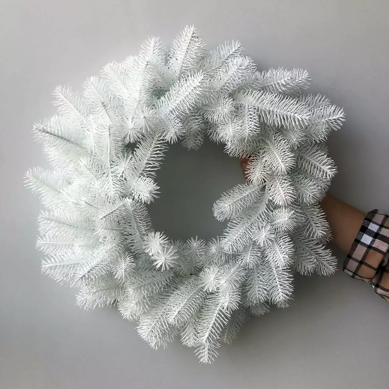 Новорічний декоративний вінок діаметром 55 см являє собою переплетені гілки штучної ялинки. Виготовлений з 100% литої хвої. Голочки як у живої ялинки, але м'які і не колючі. Без декору.
