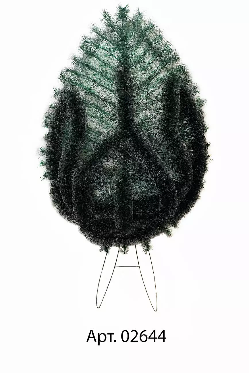 Вінок зі штучної хвої на ніжках, зашитий по горизонталі хвойними гілками. По переду оздоблений гербом України з йорша, розмір 173*90*25 см.