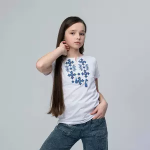Вишита футболка для дівчинки "Зоряне сяйво". Футболка білого кольору оздоблена геометричним візерунком синього кольору з кутасиками. Тканина з натуральної бавовни, яка досить гарно носитися не завдає ніяких проблем після прання, та приємна на дотик. Футболку збагачує геометричний візерунок який сімволізує гармонію, спокій, досконалість. А сині нитки є символом неба та води, вважається оберегом від недуг та душевного спокою. Така вишита футболка стані найкращим оберегом від усього злого. Ця вишиваночка прикрасити образ кожної дівчинки, тому поспішіть придбати цю стильну річ у інтернет-магазині "Меланіка"!