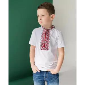 Стильна вишита футболка для маленьких парубків. Дивовижна вишиванка з коротким рукавом декорована вишуканим орнаментом в патріотичному стилі. Важливу роль у вишитій футболці відіграє колір орнаменту. Червона вишивка є символом вогню, світла, любові. Модель доповнена яскравими кутасиками і коміром-стійкою. Виконана із натурального матеріалу, така вишиванка практична - не деформується і не линяє після прання, а також приємно сідає по тілу Вашого малюка. Не пропустіть можливість придбати чудову вишиванку для улюбленої дитини в інтернет-магазині ”Меланіка”!