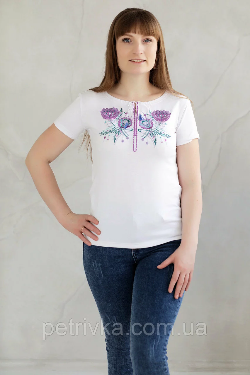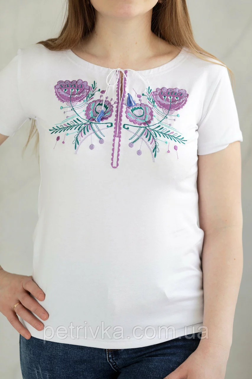 Неймовірна вишита жіноча футболка з вишитими фіолетовими нитками вишивкою