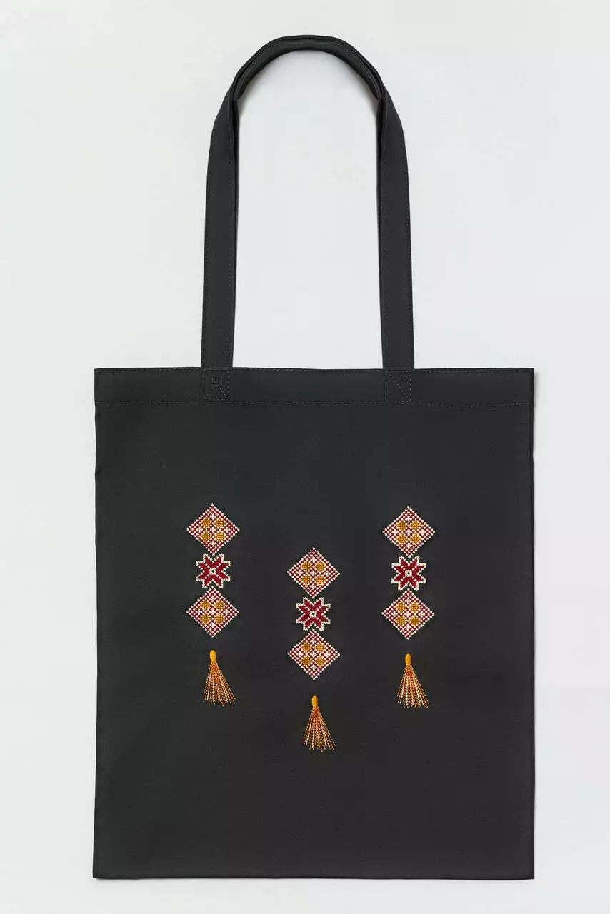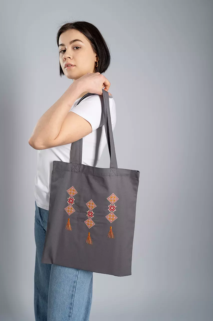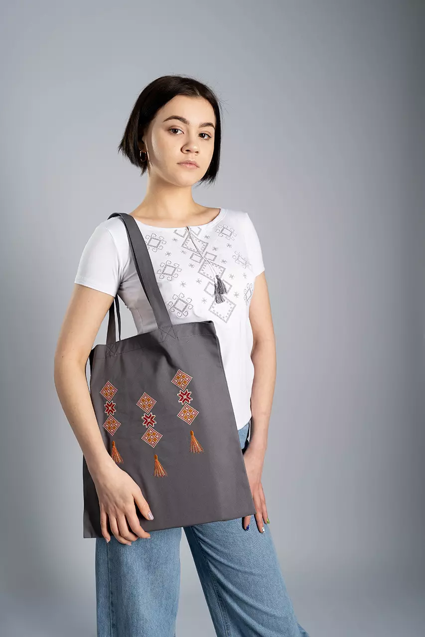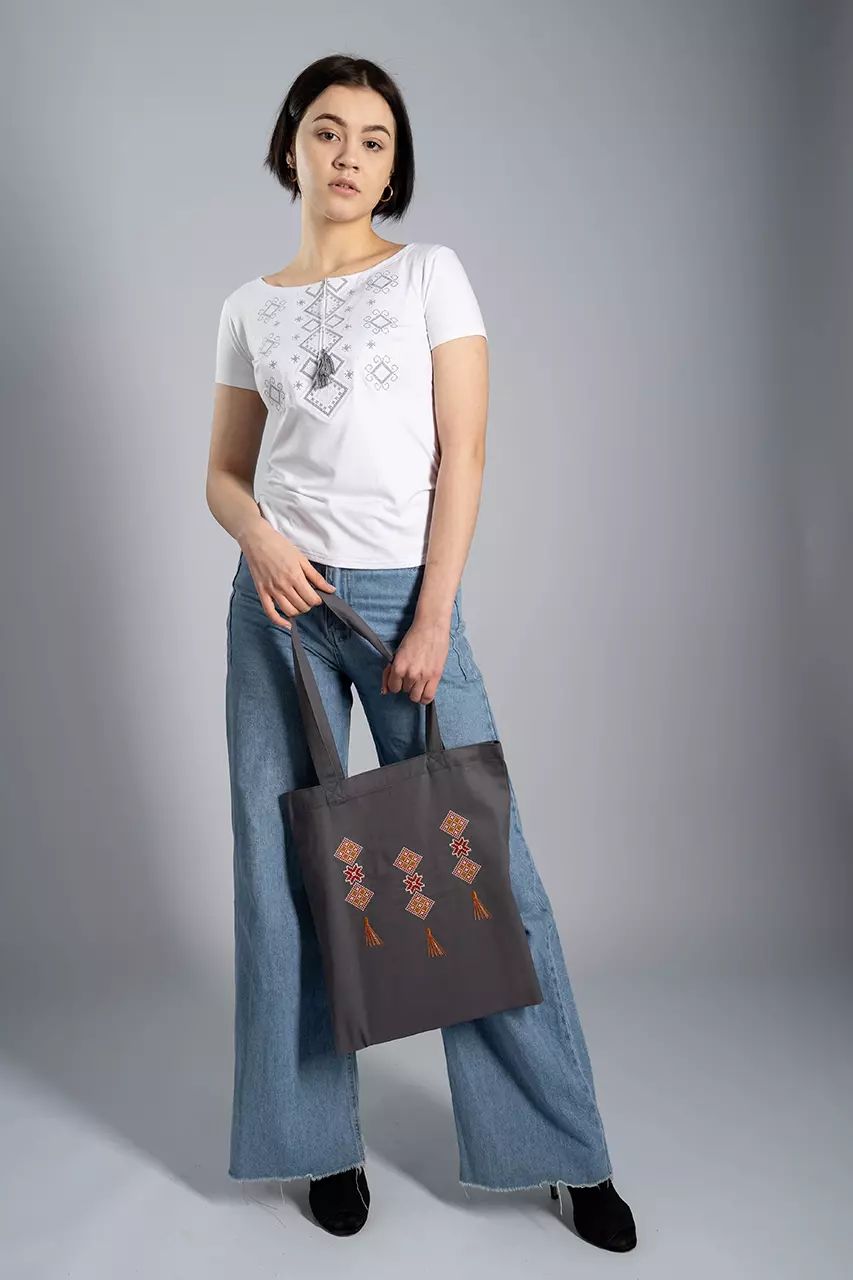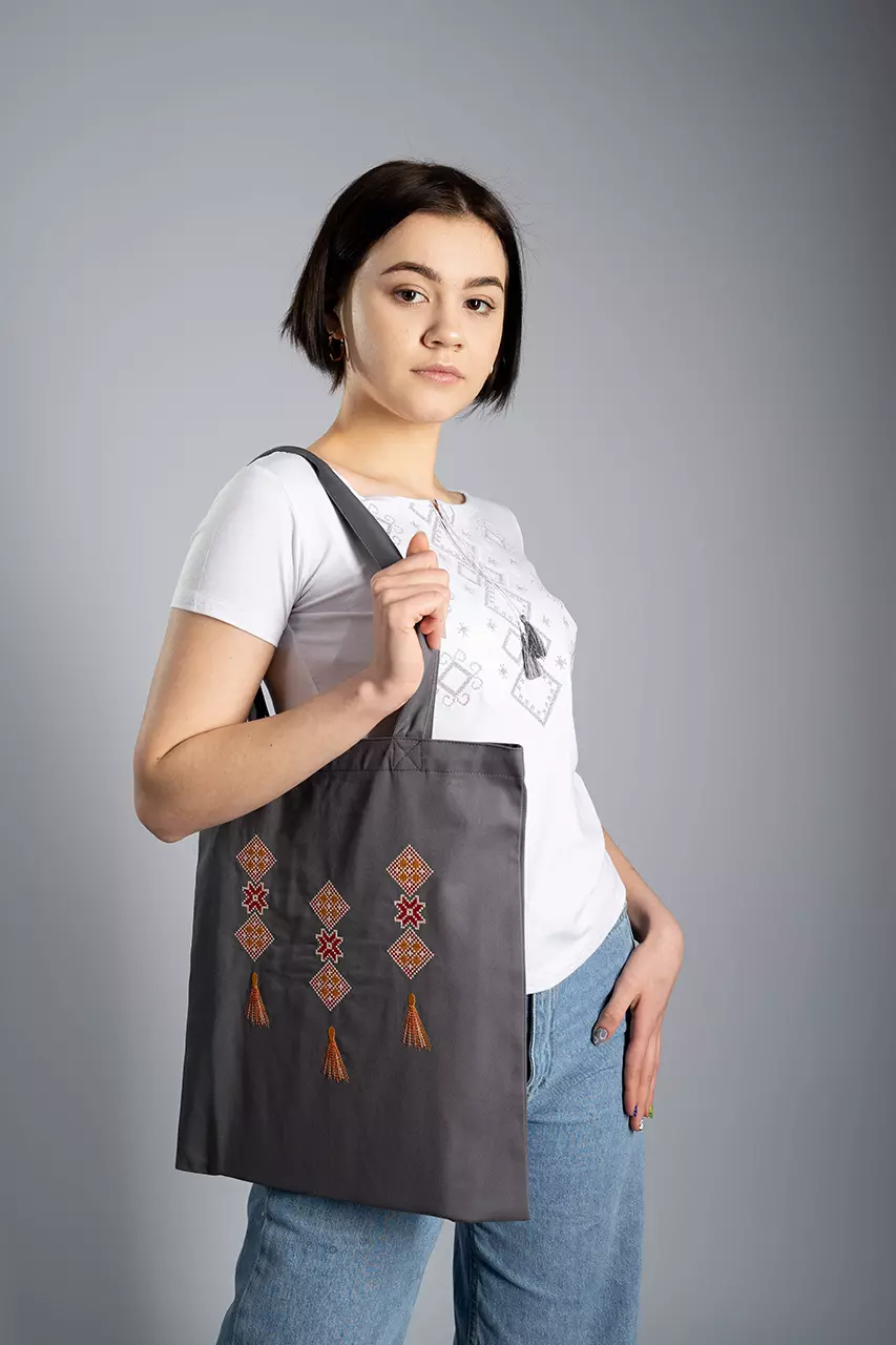Вишитий шопер для покупок в етно стилі "Китиці" у графітовому
