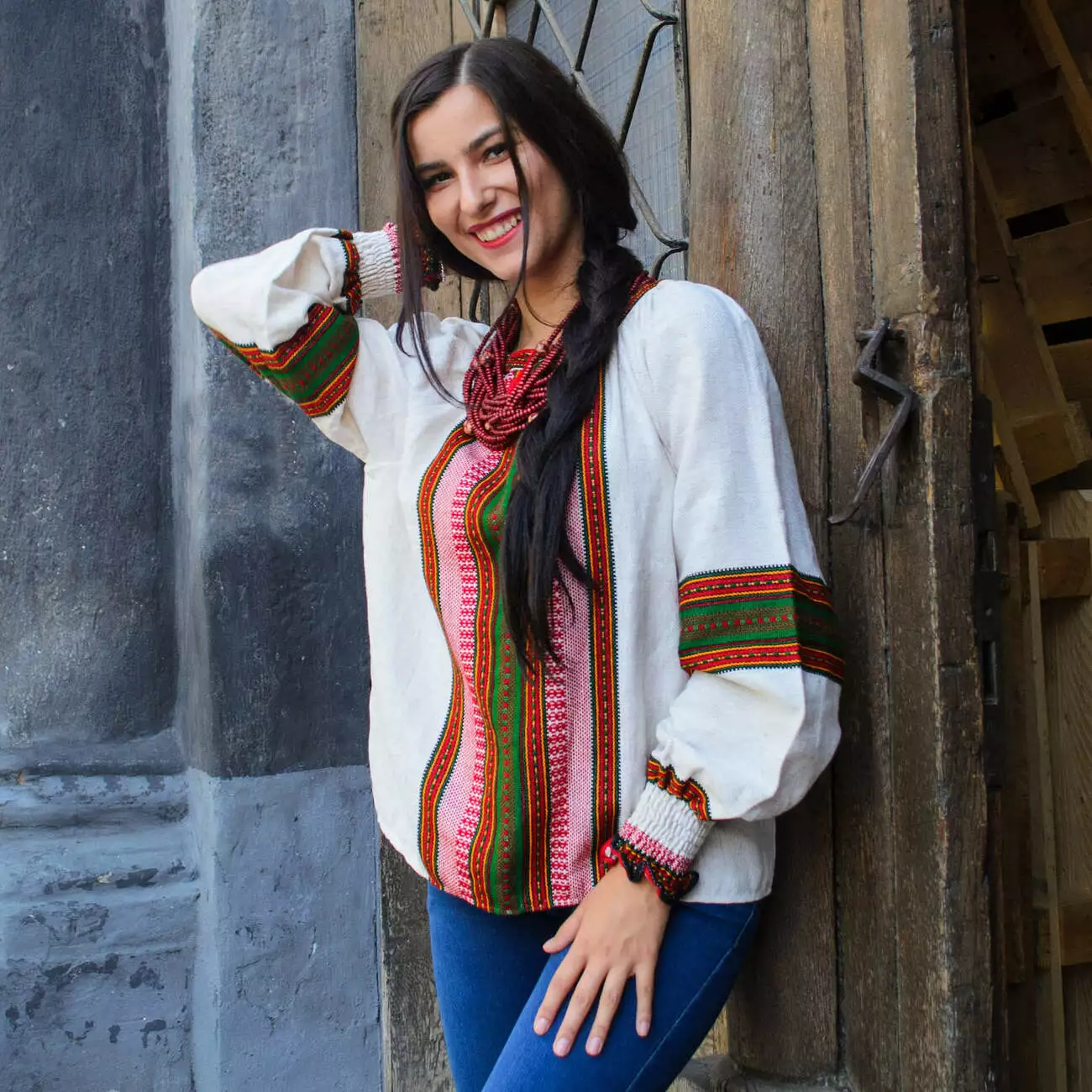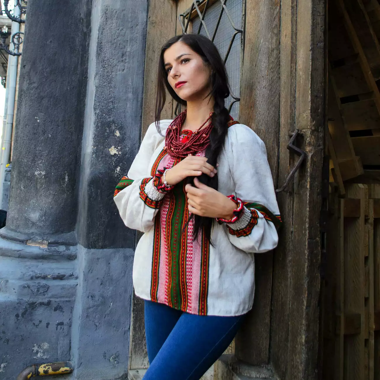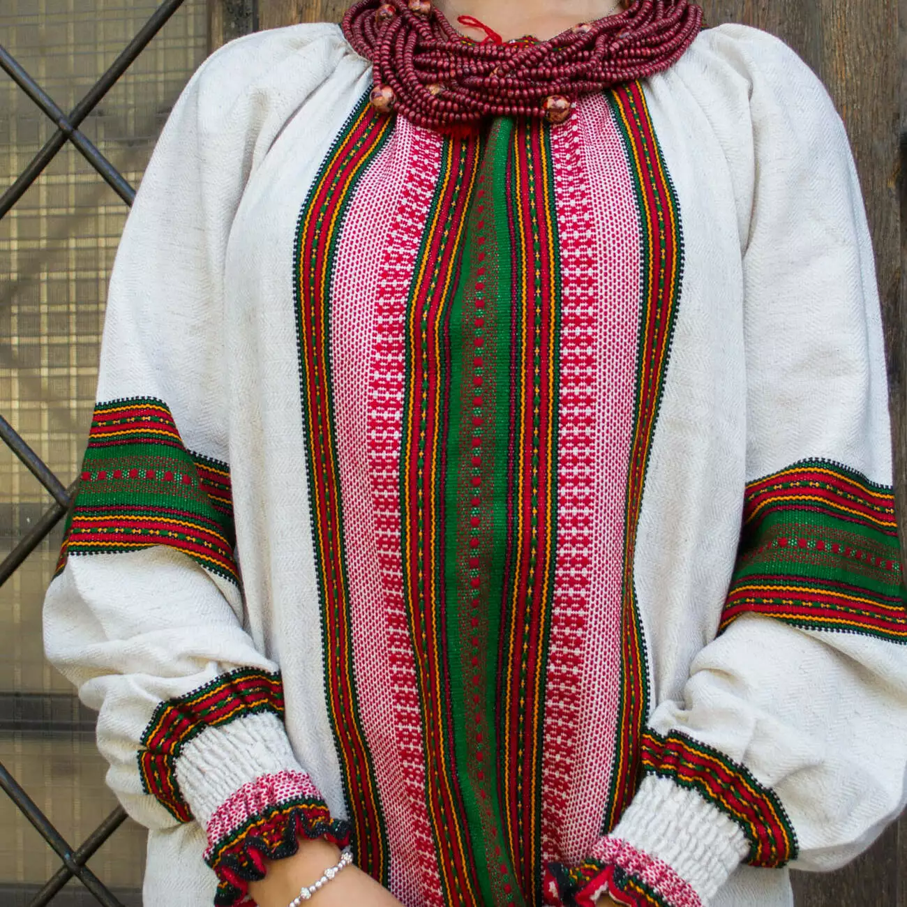 Жіноча вишита сорочка, виконана на сірому тканому полотні