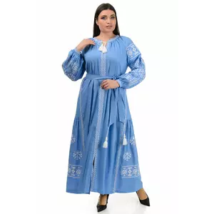 Сукня-вишиванка вільного фасону, має об'ємні рукави, а також поясок для підкреслення талії.
