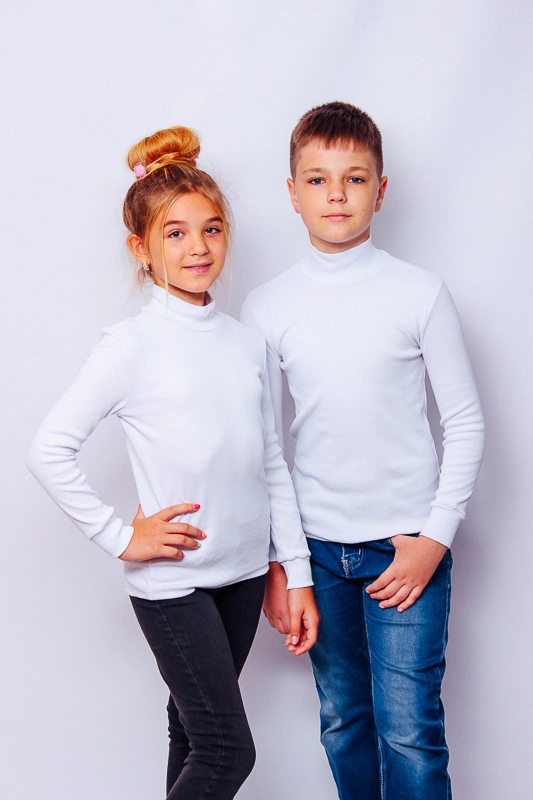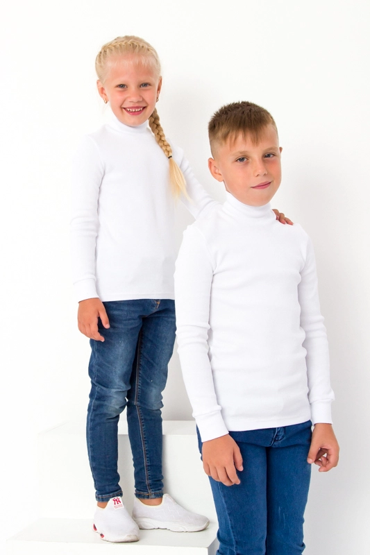 Дитяча водолазка з білого рубчику. Підходить для повсякденного носіння, зручна і комфортна. Виріб цілком підійде для комплектації шкільної форми. Така практична річ відрізняється своєю універсальністю, оскільки її можна надіти і для повсякденної прогулянки, і для офіційного заходу.