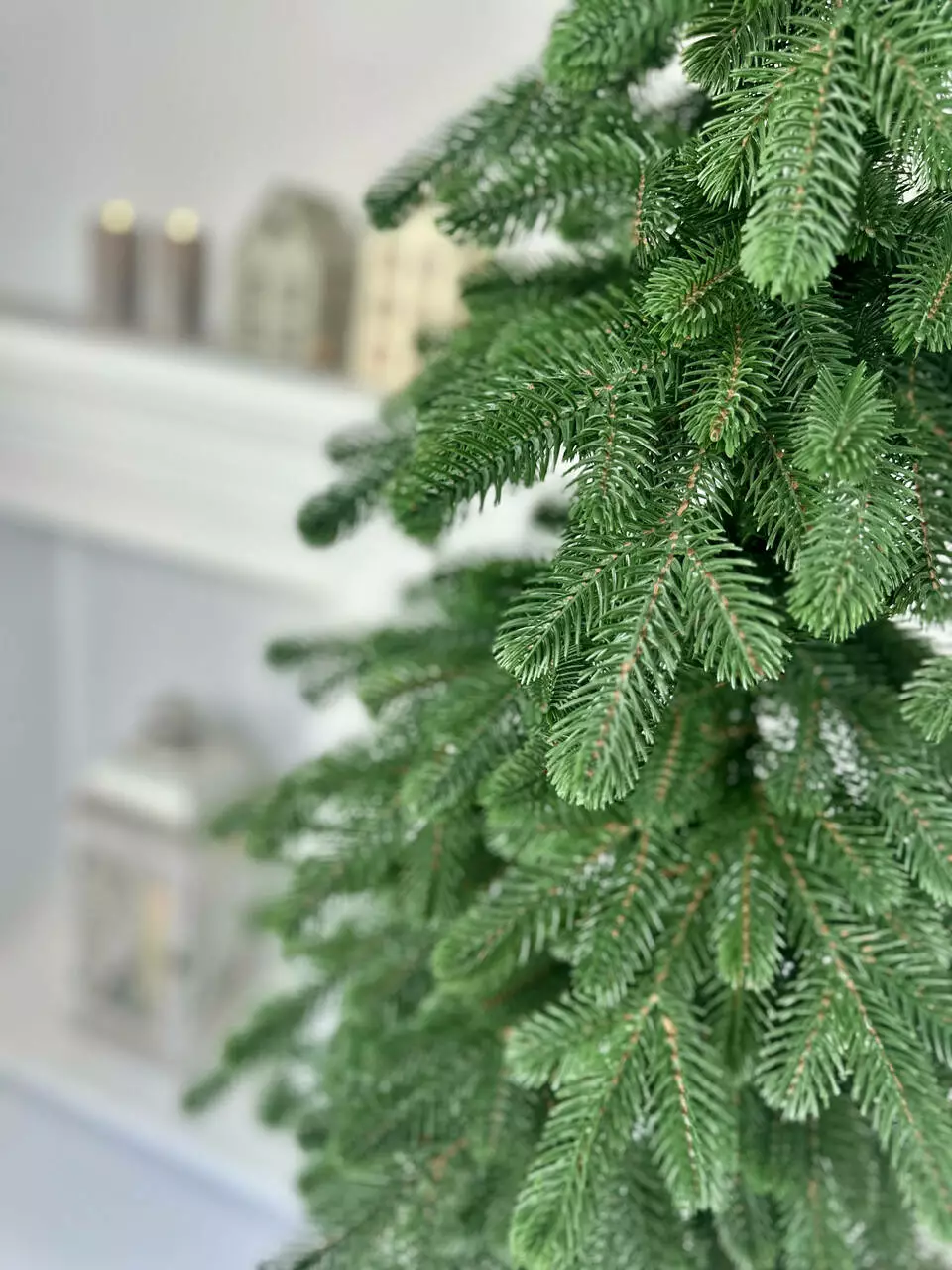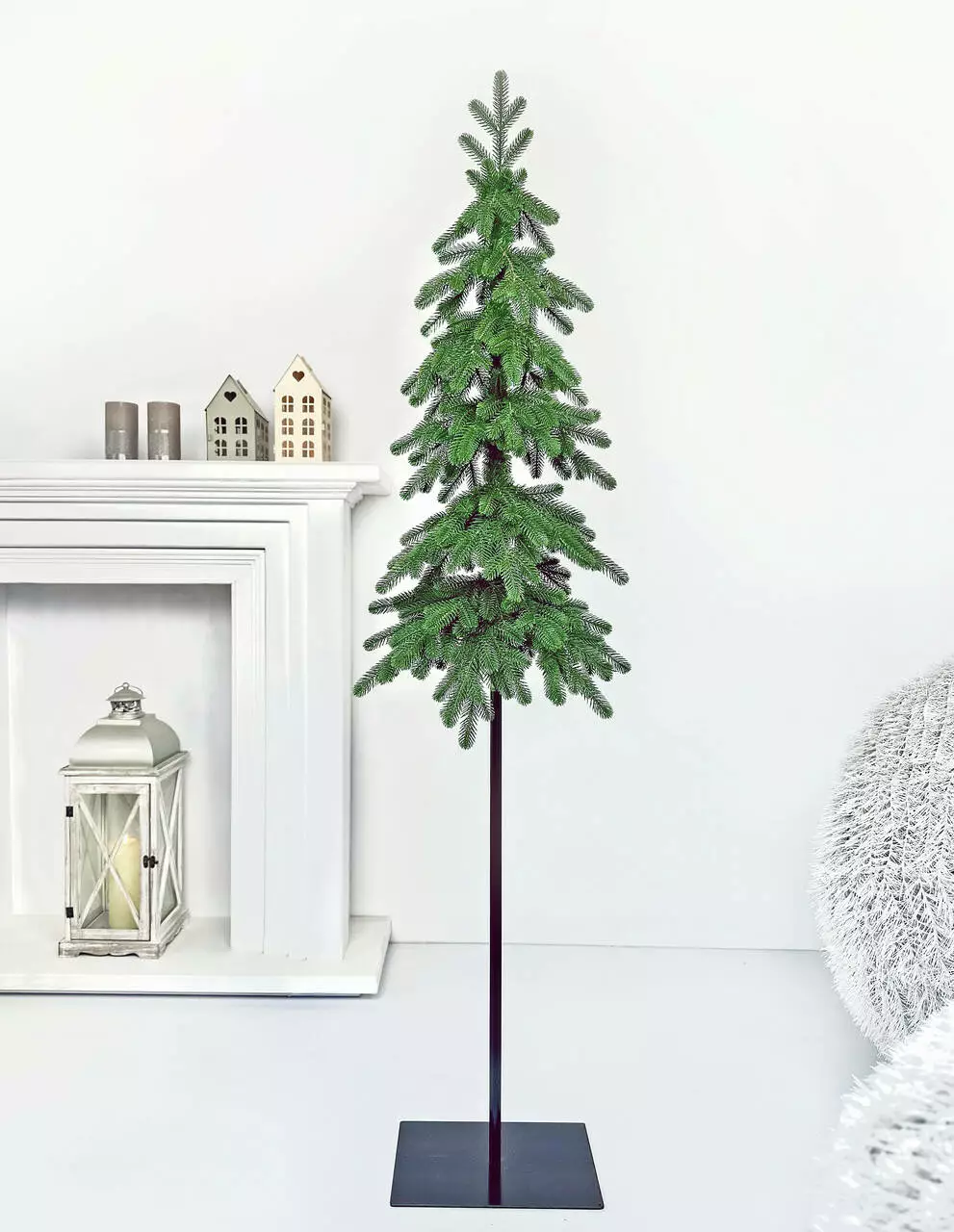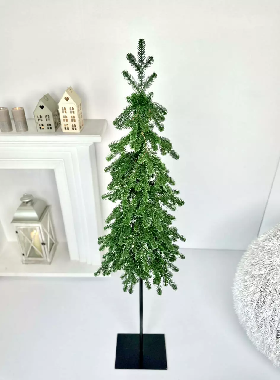 Її головна особливість — висока чорна металева підставка, яка додає легкості та створює стильний акцент у просторі. Вузька, дуже струнка форма і литі гілки з реалістичною фактурою хвої надають ялинці природного вигляду, роблячи її чудовим вибором для невеликих приміщень.