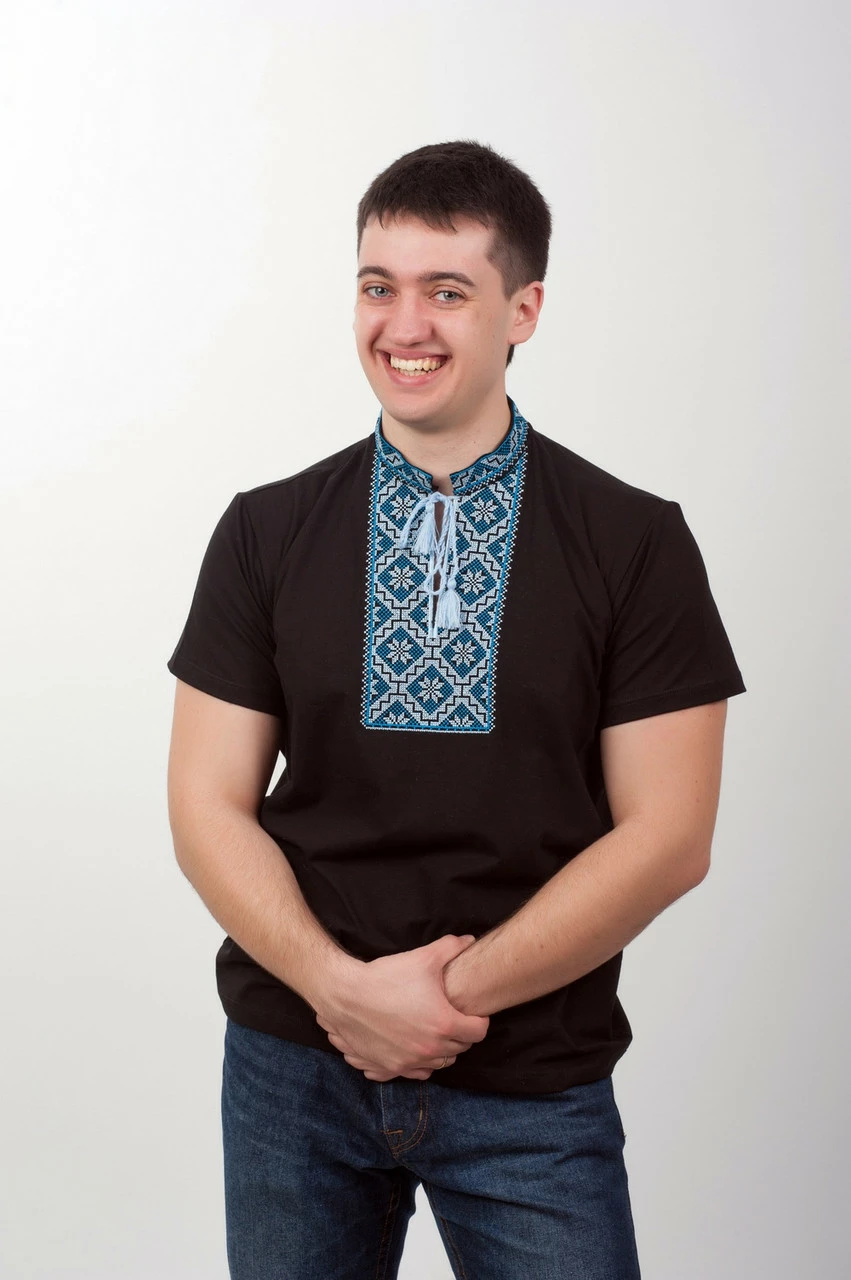Стильная черная футболка с вышивкой в сине-голубых тонах