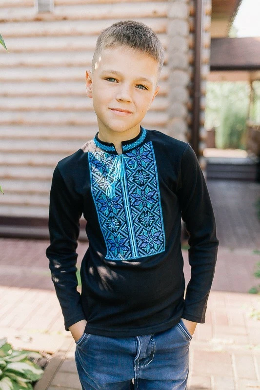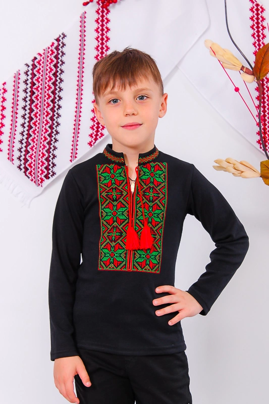 Вишиванка - особливий наряд, до якого ставляться з повагою і трепетом. Відродження доброї традиції одягати вишиванку на свято зробило її важливим елементом модних образів. Якісна і практична вишиванка з довгим рукавом з чорного інтерлоку. Модель прикрашена машинною вишивкою хрестиком на грудях і комірі-стійці. Доповнена китицями-зав'язками. Купуйте модель для школи, адже це не тільки модно, але й патріотично і актуально.