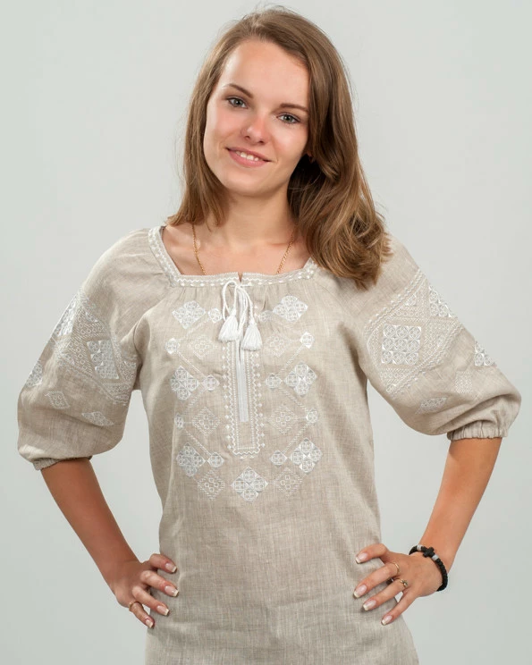 Вышитая женская сорочка из серого льна с узором Окошка
