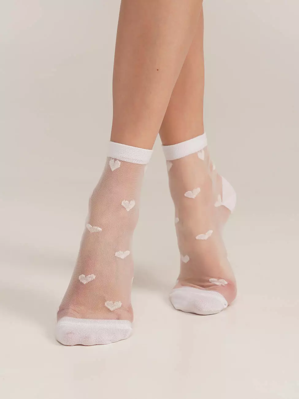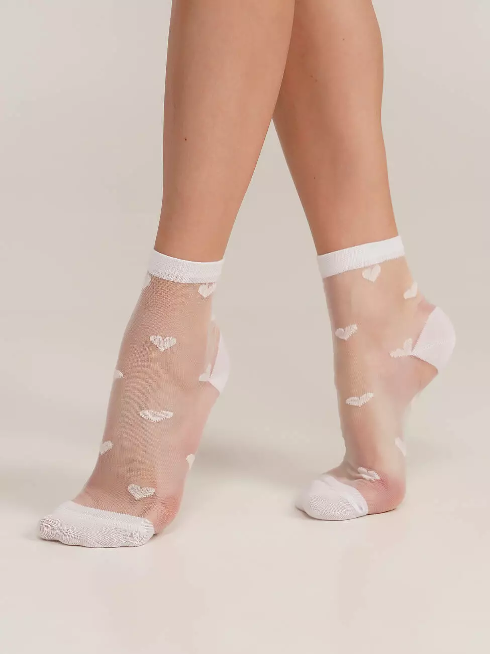 Ніжні білі шкарпетки з витонченим візерунком у вигляді сердечок — ідеальний вибір для створення романтичного образу. Модель виконана з тонкої напівпрозорої тканини, що додає легкості та елегантності. Стильні жіночі шкарпетки чудово поєднуються як із повсякденним, так і святковим одягом.