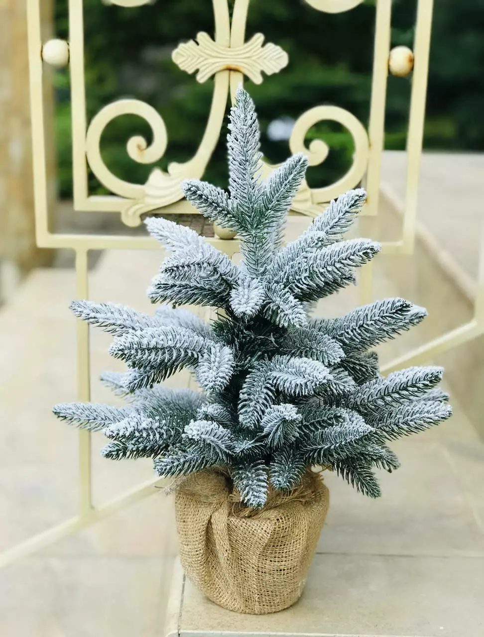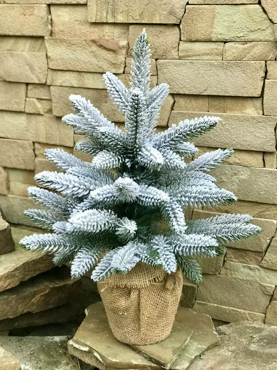 Компактна штучна лита ялинка виглядає ошатно навіть без додаткових прикрас. Всі голочки - литі, точна 3D імітація хвої живої ялинки. Встановлена у горщик, прикрашений мішковиною, з обважнювачем всередині - для захисту від перекидання. Об'ємне густе напилення на ялинці реалістично імітує сніг, який тільки що впав на гілки пухнастими пластівцями. Матеріалом розпилення є натуральна бавовна, він екологічний і не має запаху, безпечний для дітей і дорослих.