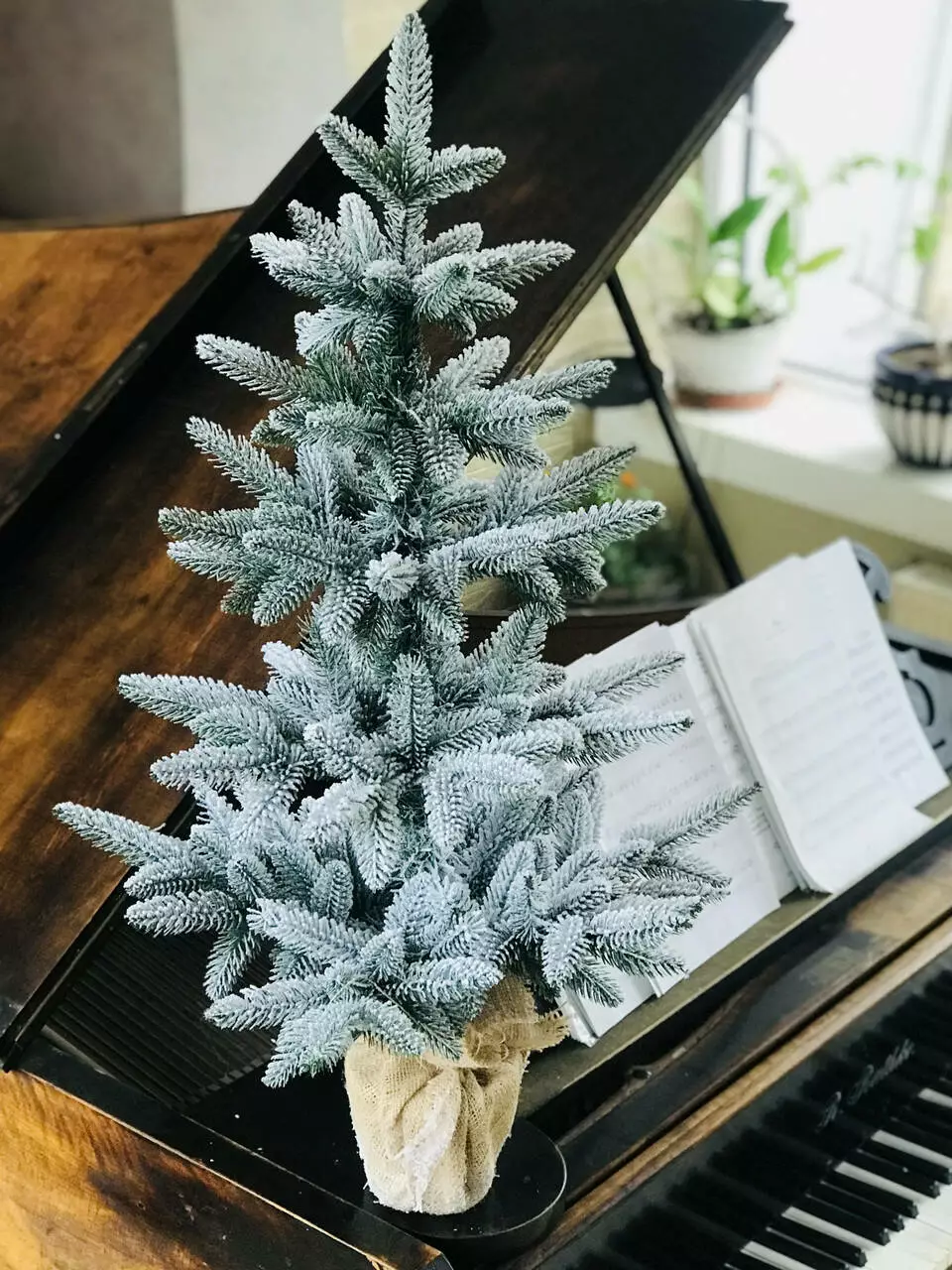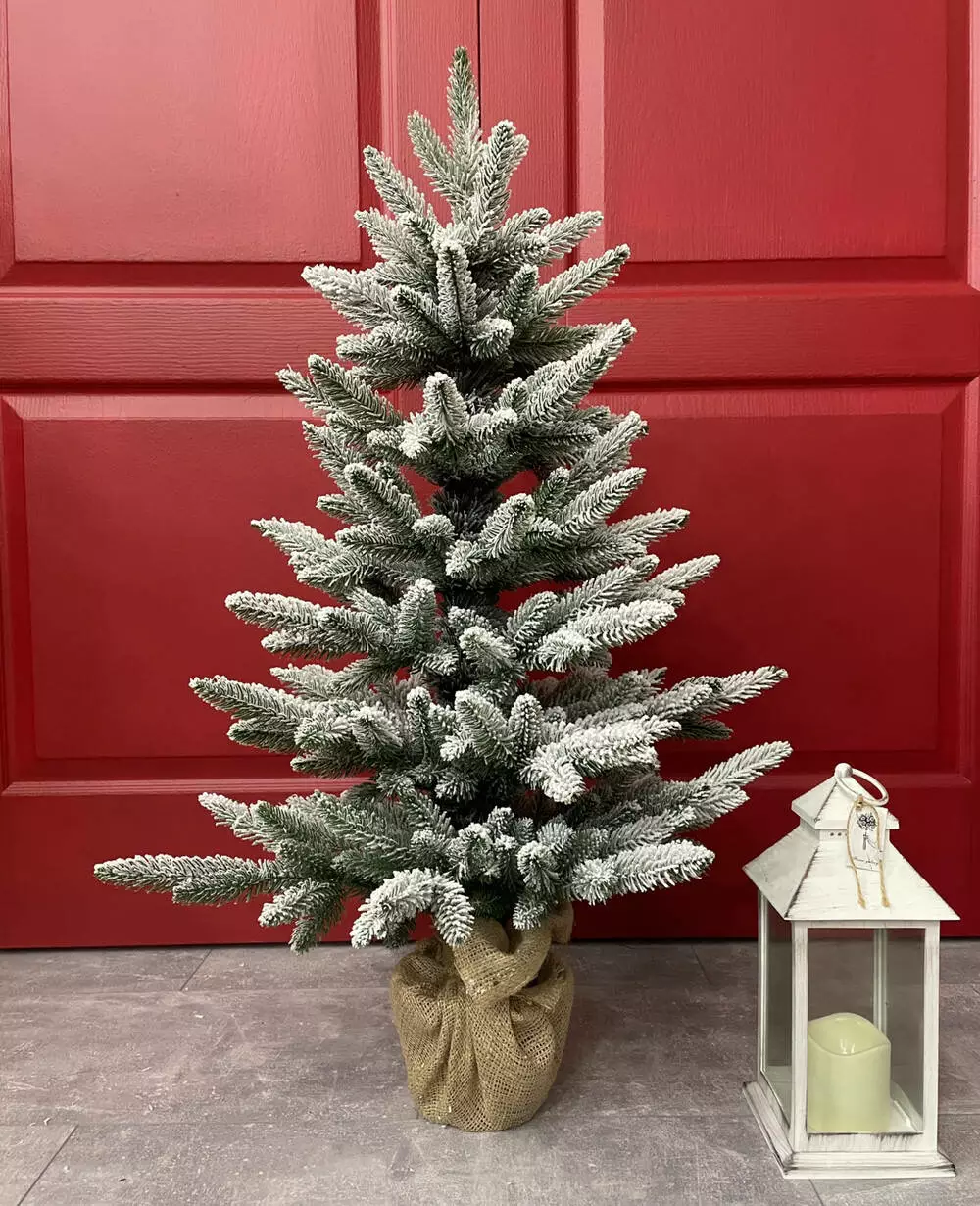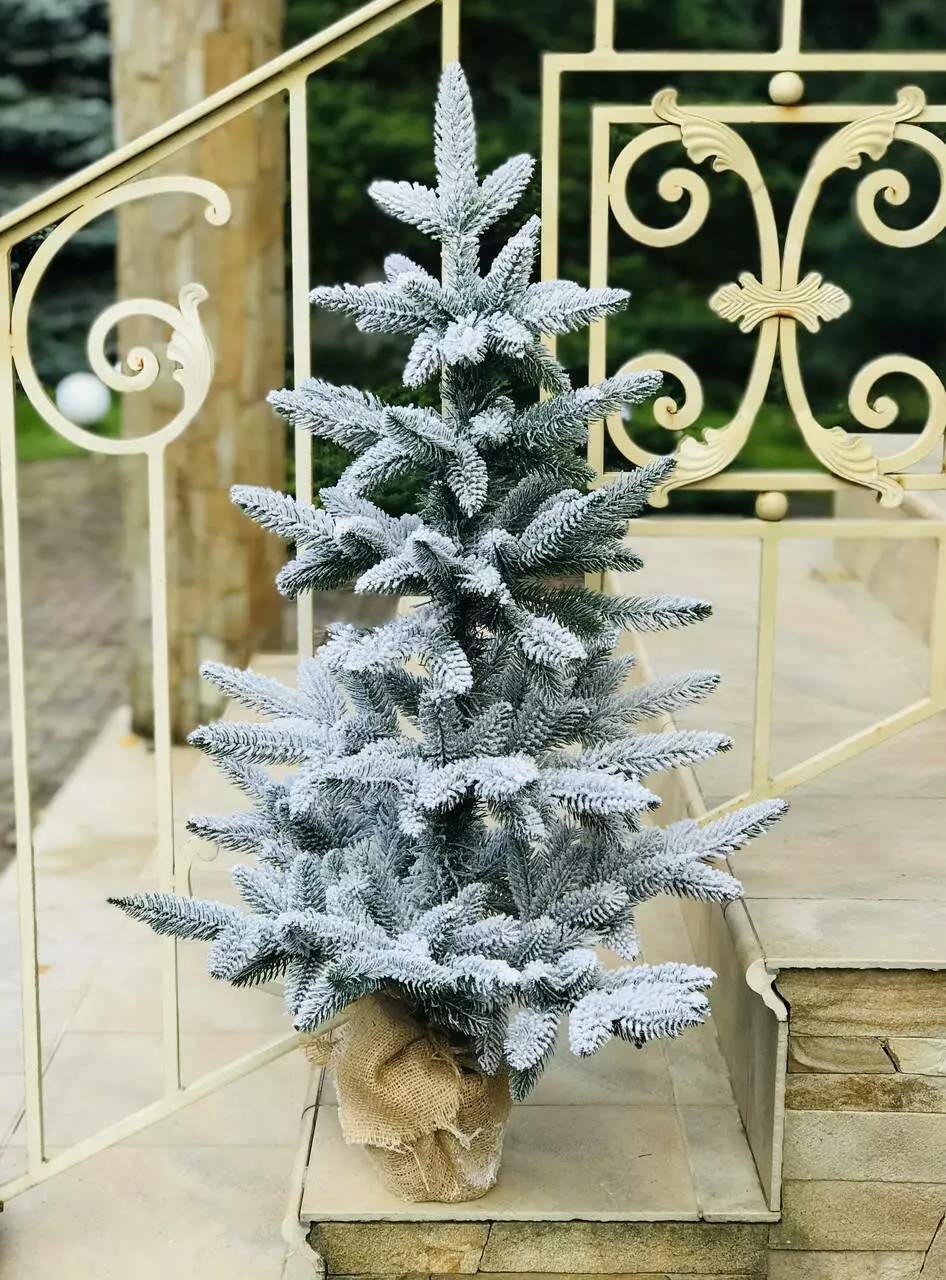 Компактна штучна лита ялинка виглядає ошатно навіть без додаткових прикрас. Всі голочки – литі, точна 3D імітація хвої живої ялинки. Встановлена в горщик, прикрашений мішковиною, з обтяжувачем усередині - для захисту від перекидання. Об'ємне густе напилення на ялинці, реалістично імітує сніг, що щойно впав на гілки пухнастими пластівцями. Матеріалом розпилення є натуральна бавовна, вона екологічна і не має запаху, безпечна для дітей та дорослих.