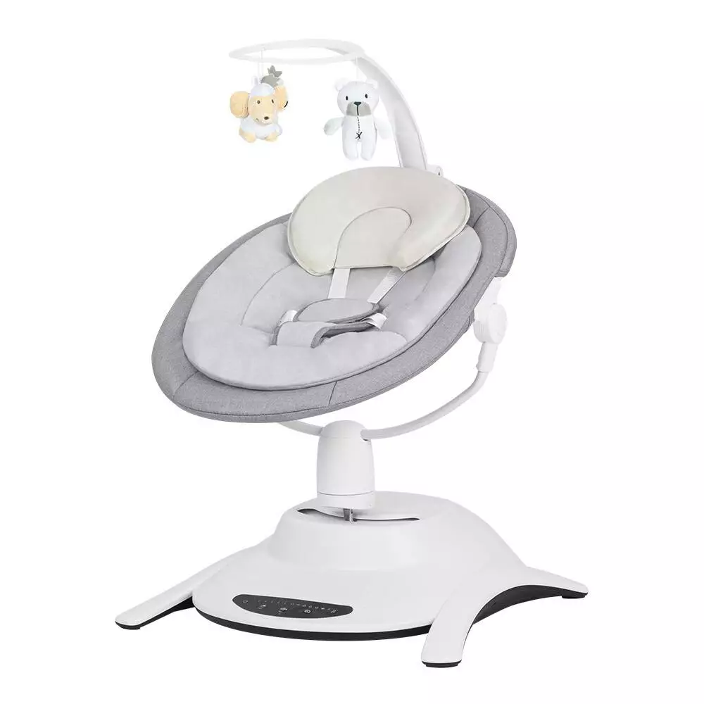 Робота гойдалки змодельована за типом рухів, які дитині нагадують інтуїтивне гойдання. Гойдалка має 6 режимів гойдання - 5 основних і 1 автоматичний, який змінюється кожні 16 секунд. Вибір із 5 режимів гойдання дасть змогу налаштувати інтенсивність відповідно до вподобань дитини. Сидіння обертається на 360°, даючи змогу змінювати напрямок гойдання і налаштовувати сидіння так, щоб завжди можна було підтримувати візуальний контакт з дитиною. Сидіння має 3-ступеневе регулювання нахилу - від лежачого положення, до сидячого. У нічному режимі виріб повільно сповільнюється до повної зупинки. Автоматичний детектор руху вмикає гойдання і музику. Налаштування можна змінювати на сенсорній панелі управління або віддалено за допомогою пульта дистанційного керування. Широке сидіння забезпечує зручне і безпечне положення дитини. Гойдалка має 5-точкові ремені безпеки. У комплект також входить м'яка подушка, яка пристосовується до тіла дитини і забезпечує їй достатню підтримку. У комплект входить карусель з 3 іграшками для тренування уваги дитини. Нековзні накладки захищають підлогу від подряпин. Розміри ящика: 61.50 * 28 * 51.50