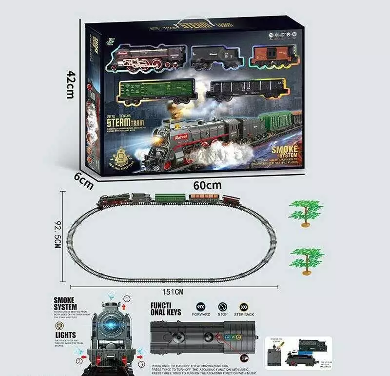 Залізниця 602 B (10) 5 вагонів довжиною 93см, дорога 99х138 см, світло, парогенерація, звук-беззвуч. режим, рух вперед-назад, акум. 3.7V, в коробці
