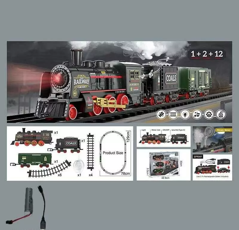 Главная > Каталог > Игрушки > Железные дороги игровые > Залізниця 652 X12 (42/2) парогенерація, підсвічування, звук, акумулятор, дорога 78х129 см, 1 локомотив, 2 вагони, 12 елементів дороги, в коробці оптом