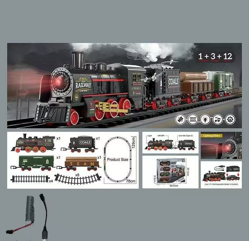 Главная > Каталог > Игрушки > Железные дороги игровые > Залізниця 652 X14 (36/2) парогенерація, підсвічування, звук, акумулятор, дорога 78х129 см, 1 локомотив, 3 вагони, 12 елементів дороги, в коробці оптом