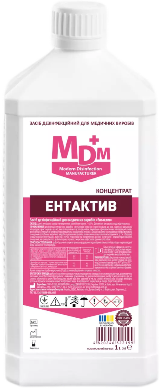 Засіб дезінфекційний для медичних виробів Ентактив - концентрований дезінфекційний засіб широкого спектра антимікробної дії. Має виражені бактерицидні, віруліцидні, фунгіцидні та туберкулоцидні властивості, у тому числі проти збудників туберкульозу, гепатитів А і В, поліомієліту, ВІЛ. Робочі розчини мають мийні властивості, не викликають корозії металів, не пошкоджують вироби зі скла, полімерів, гуми, добре змиваються, не залишають плям та нальоту, не фіксують органічні забруднення.