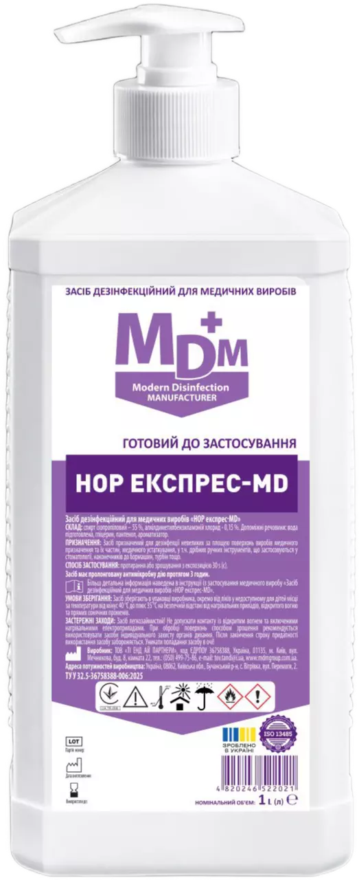 Засіб дезінфекційний для медичних виробів НОР експрес-MD - готовий до застосування дезінфекційний засіб у вигляді прозорої безбарвної або забарвленої рідини із характерним запахом спирту. Має виражену бактерицидну, віруліцидну, фунгіцидну та туберкулоцидну дію. Підходить для швидкої дезінфекції медичних виробів, у тому числі дрібних інструментів, стоматологічних наконечників, бормашин, турбін та поверхонь медичного обладнання. Не пошкоджує більшість матеріалів, не фіксує білкові забруднення, швидко висихає та не потребує змивання (окрім випадків контакту зі слизовими оболонками). Має пролонговану антимікробну дію до 3 годин.