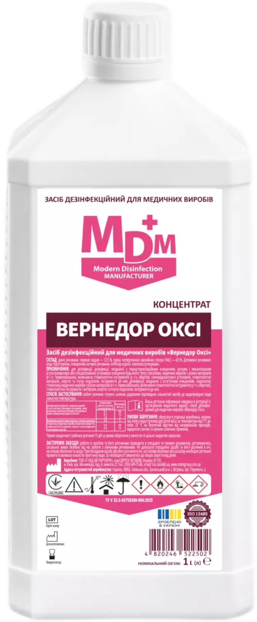 Засіб дезінфекційний для медичних виробів Вернедор-Оксі - Концентрований дезінфекційний засіб широкого спектра антимікробної дії. Має виражені бактерицидні, віруліцидні, фунгіцидні та спороцидні властивості, у тому числі проти збудників туберкульозу, гепатитів, ВІЛ, госпітальних штамів, грибкових інфекцій, спор та найпростіших. Робочі розчини мають мийні, очищувальні, емульгуючі та дезодоруючі властивості, не фіксують органічні забруднення, легко змиваються, не пошкоджують метал, скло, полімери, гуму та лакофарбові покриття. Засіб біорозкладний і придатний до використання після заморожування та відтавання.