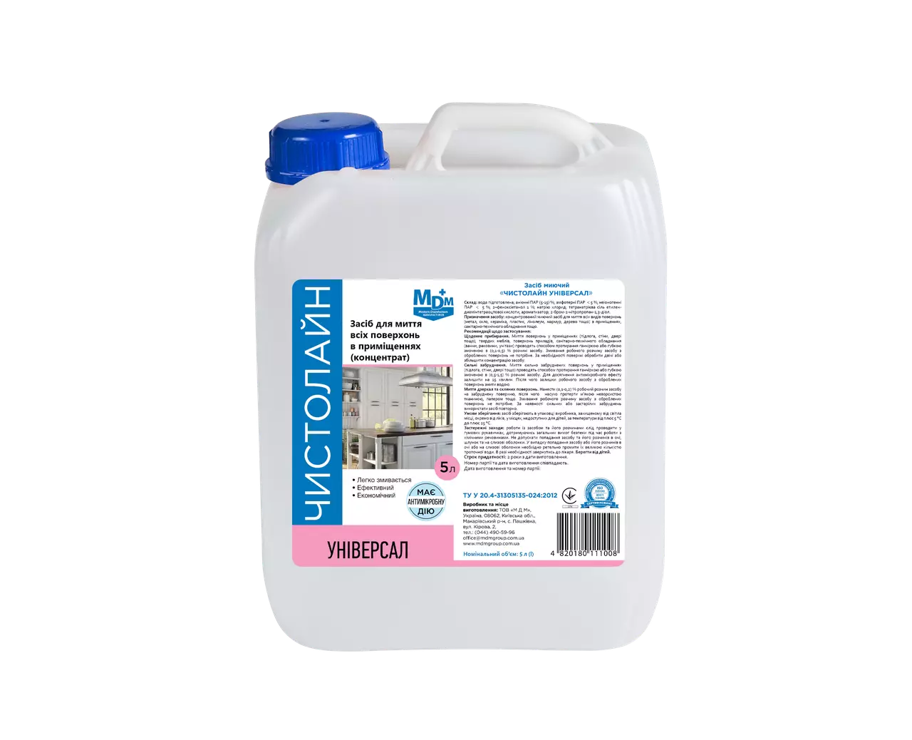 Миючий засіб «Чистолайн Універсал» — це концентрований прозорий мийний засіб із вмістом аніонних, неіоногенних і амфотерних ПАР, дезінфектанта (2-феноксіетанолу) та допоміжних компонентів. Засіб ефективно усуває органічні забруднення з різних типів поверхонь, володіє антимікробною дією, не залишає плям і нальоту, усуває неприємні запахи й не фіксує бруд. Підходить для щоденного прибирання, а також очищення сильно забруднених поверхонь, забезпечуючи гігієнічну чистоту без шкоди для оброблюваних матеріалів.