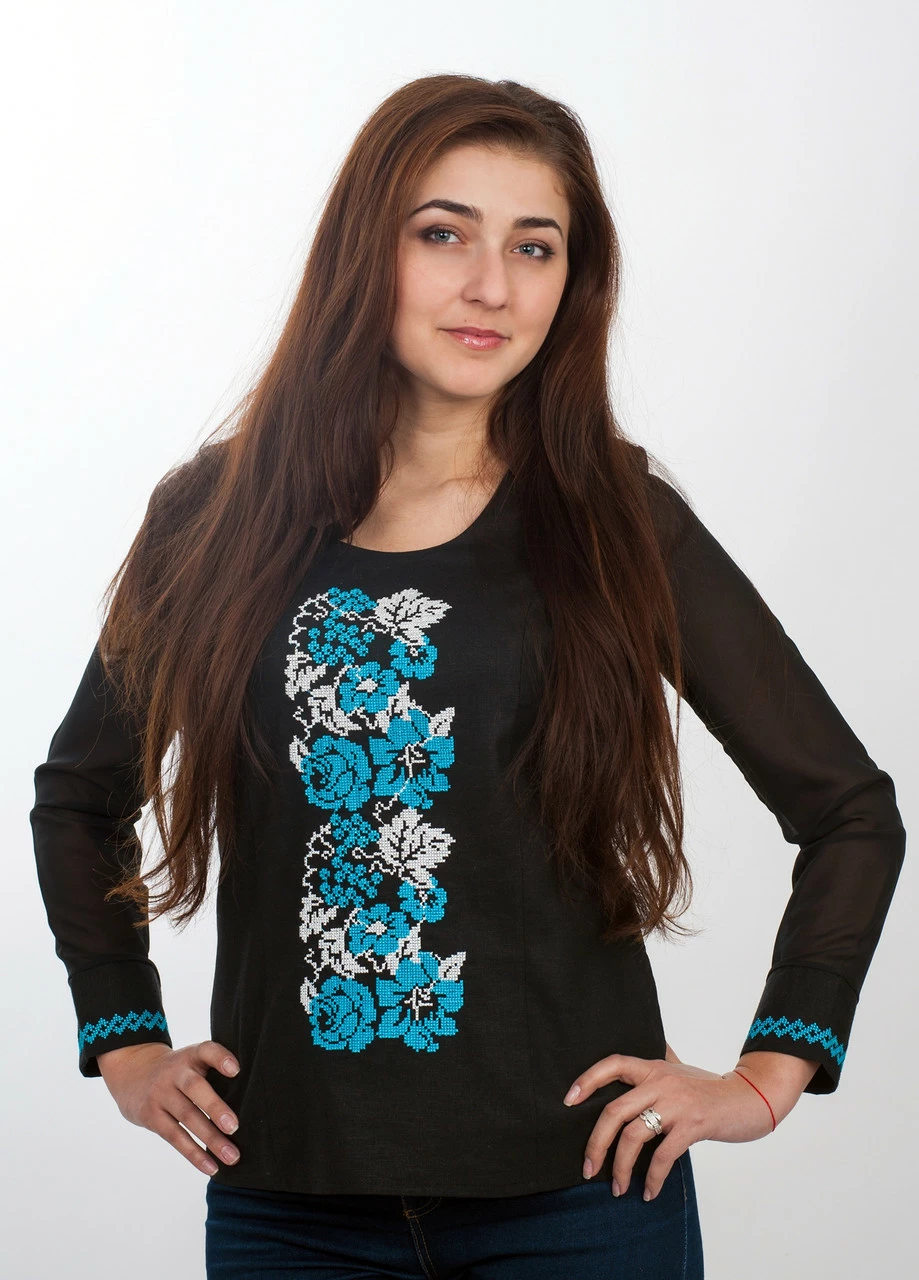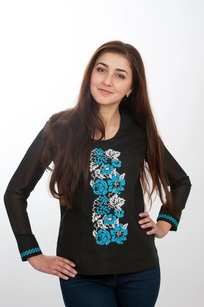 узором в голубых тонах. Благодаря удачному крою женская вышиванка