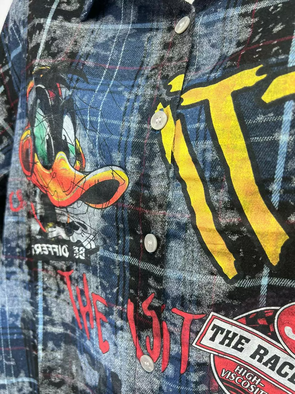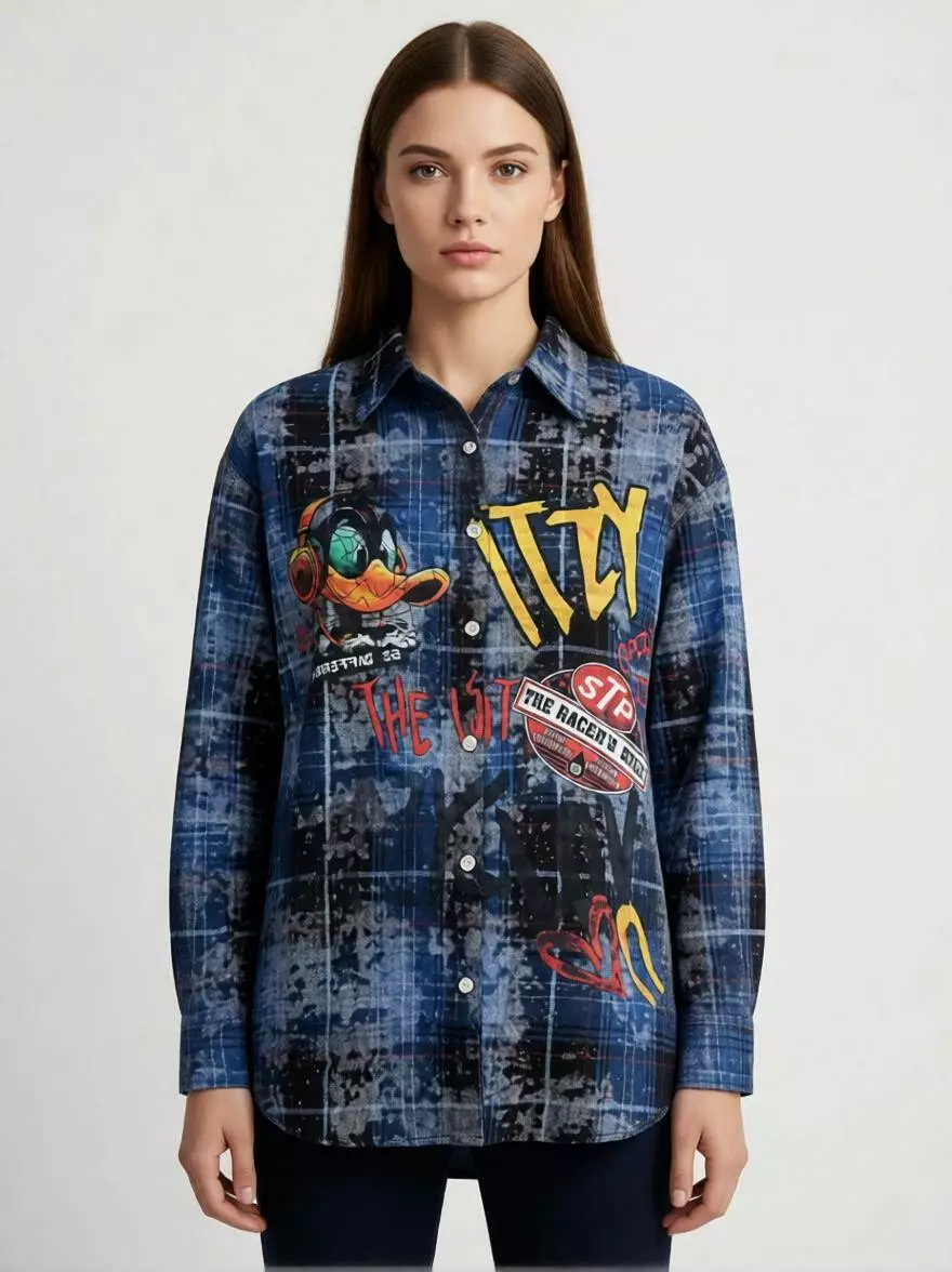 Ультрамодна жіноча сорочка у виразному та яскравому кольорі електрик. Модель виконана з м'якої фланелі з ефектом виварювання тканини, що створює неповторний стиль Oversize Grunge. Поєднання глибокого синього кольору та графіті-принтів робить цей образ по-справжньому незабутнім.