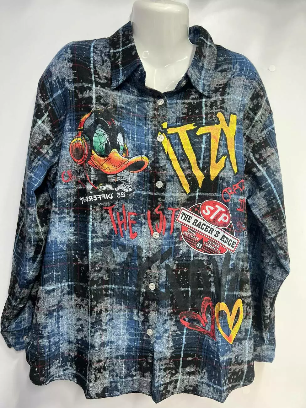 Дизайн: Культовий принт Даффі Дак, яскраві написи "CRAZY LOVE", "ITZY" та сучасні графіті-елементи.