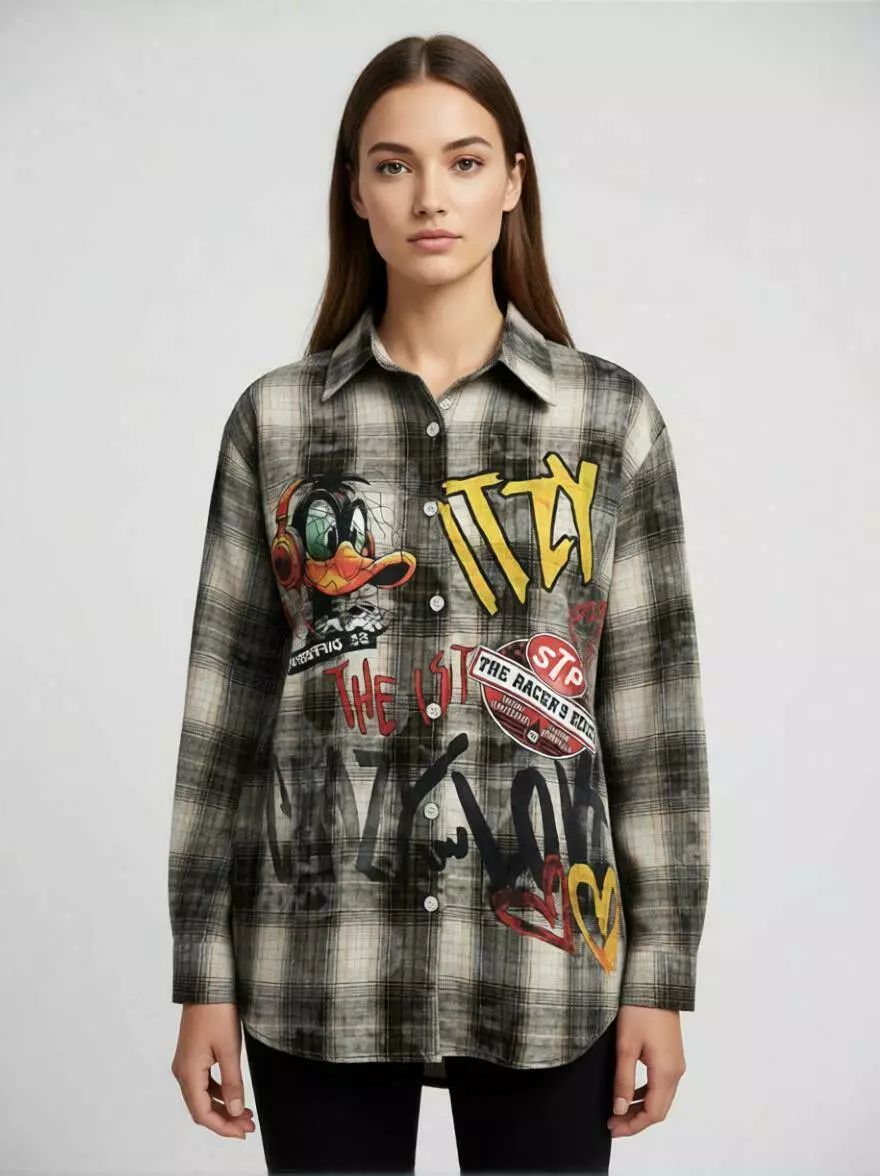 Трендова жіноча сорочка у стильному та практичному кольорі хакі. Модель виконана з м'якої фланелі з ефектом виварювання, що додає образу нотки вінтажного стилю Oversize Grunge. Поєднання класичної клітинки та зухвалих принтів робить цю річ незамінною у сучасному гардеробі.