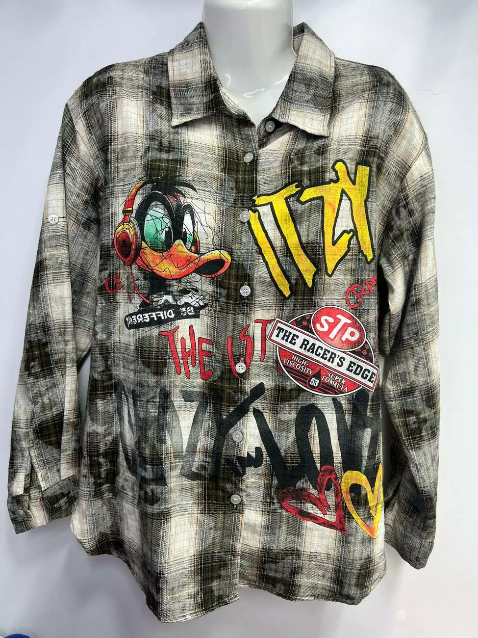 • Дизайн: Культовий принт Даффі Дак, графіті-написи "CRAZY LOVE", "ITZY" та сучасні акценти.