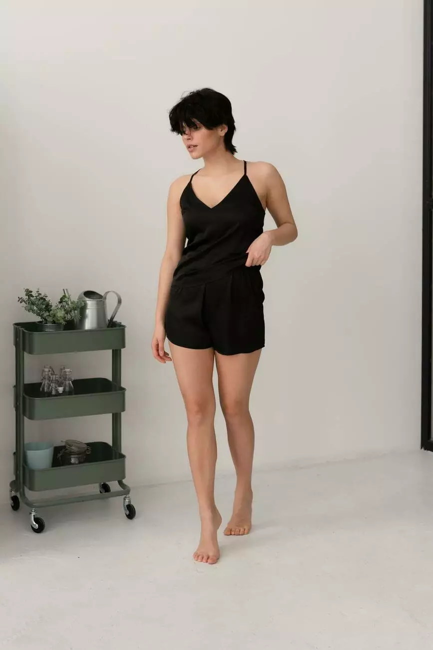 Виготовлена з найкращого шовку Армані, ця піжама складається з шортів та майки на тонких бретельках, які надзвичайно приємні на дотик і забезпечують максимальний комфорт.