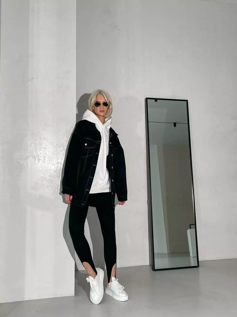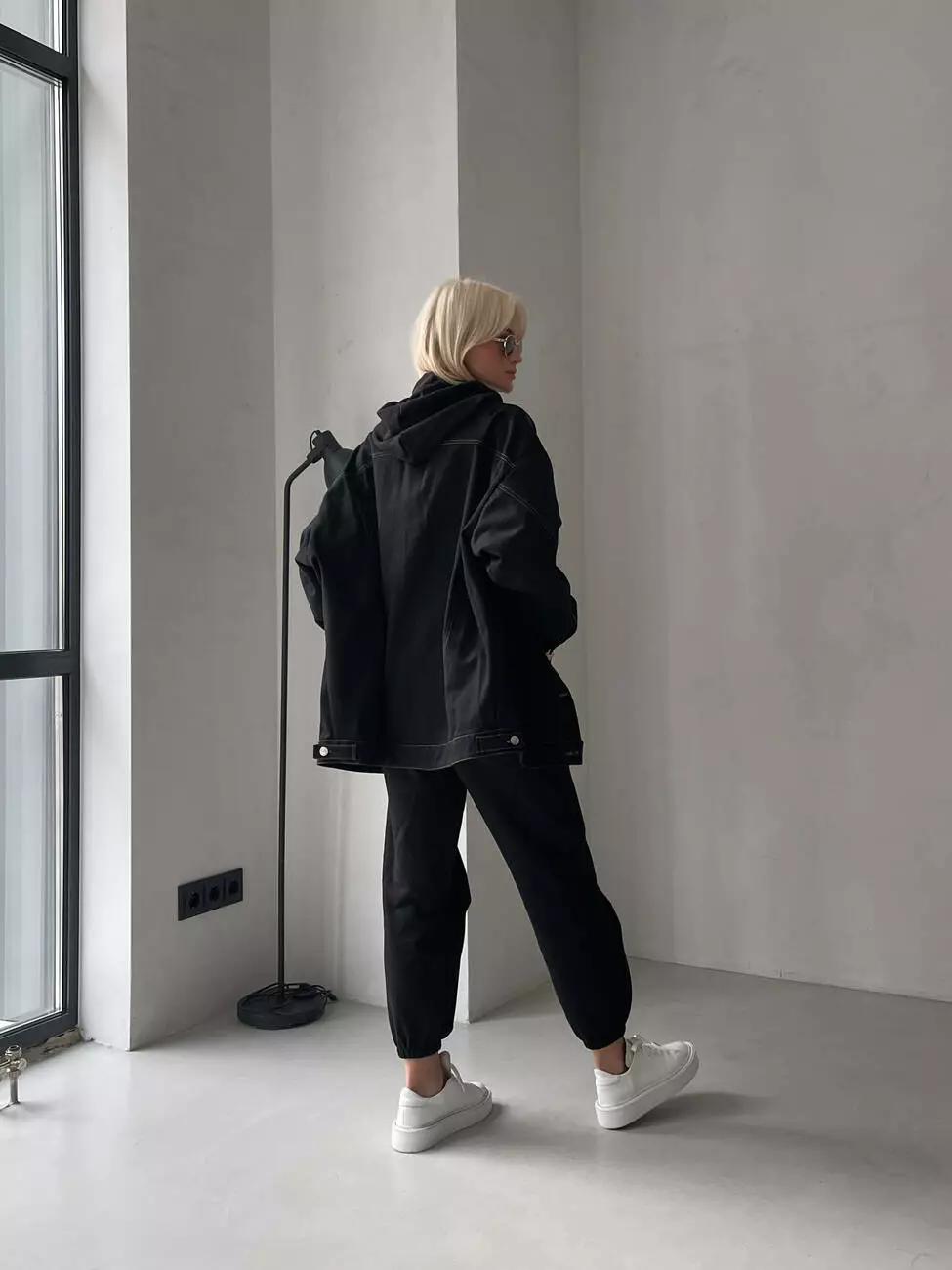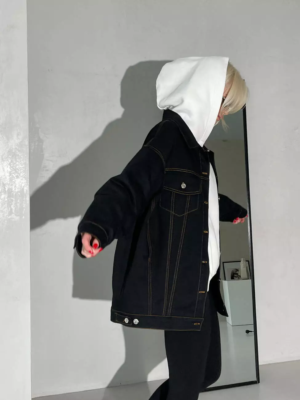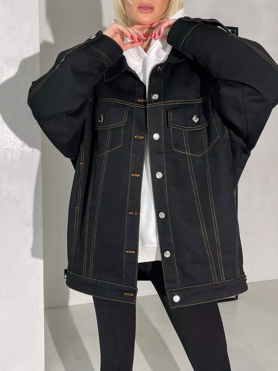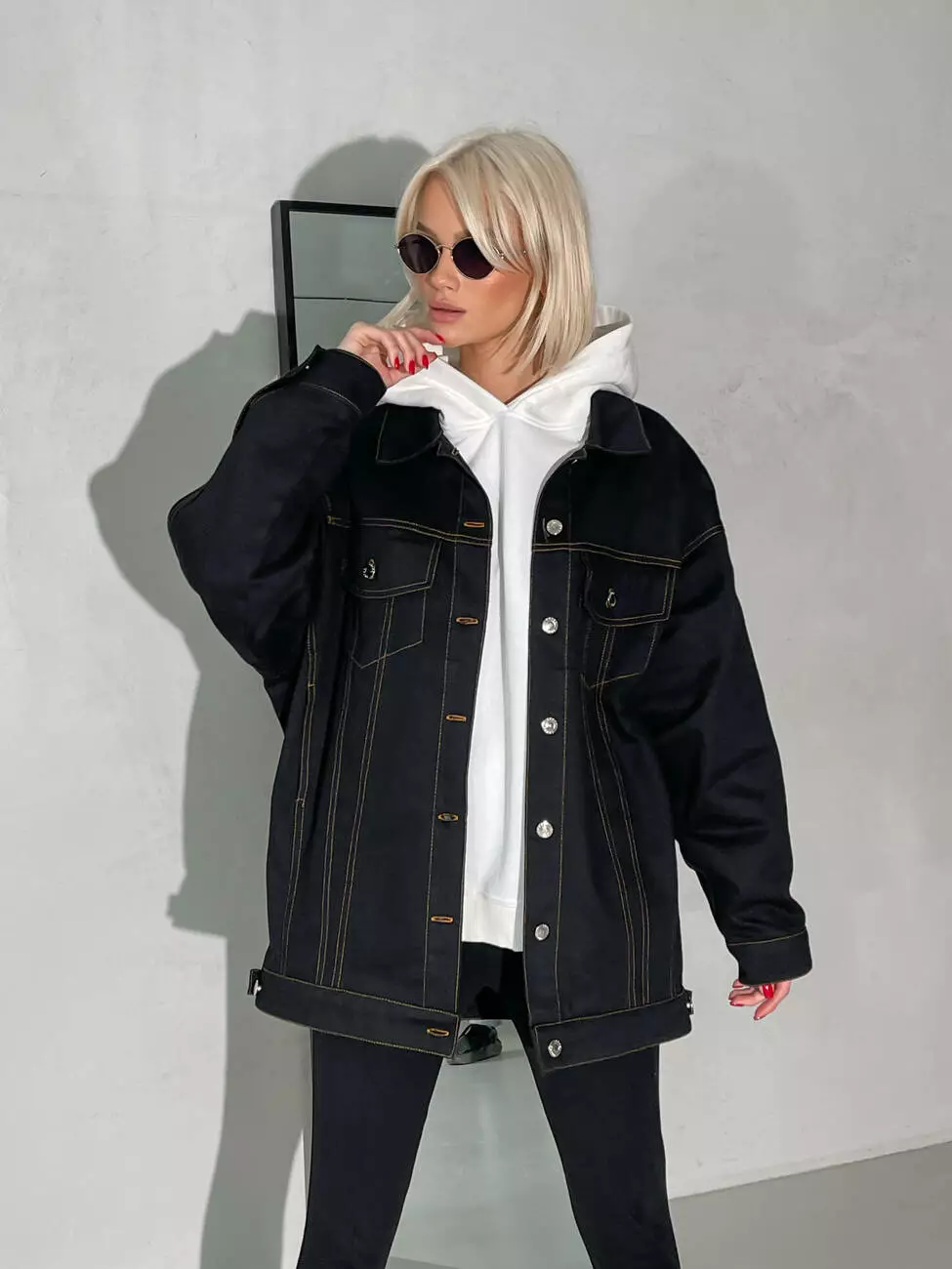 Модель виконана з деніму, щільного матеріалу, який утримує форму, має відкладний комір та застібається на ґудзики.