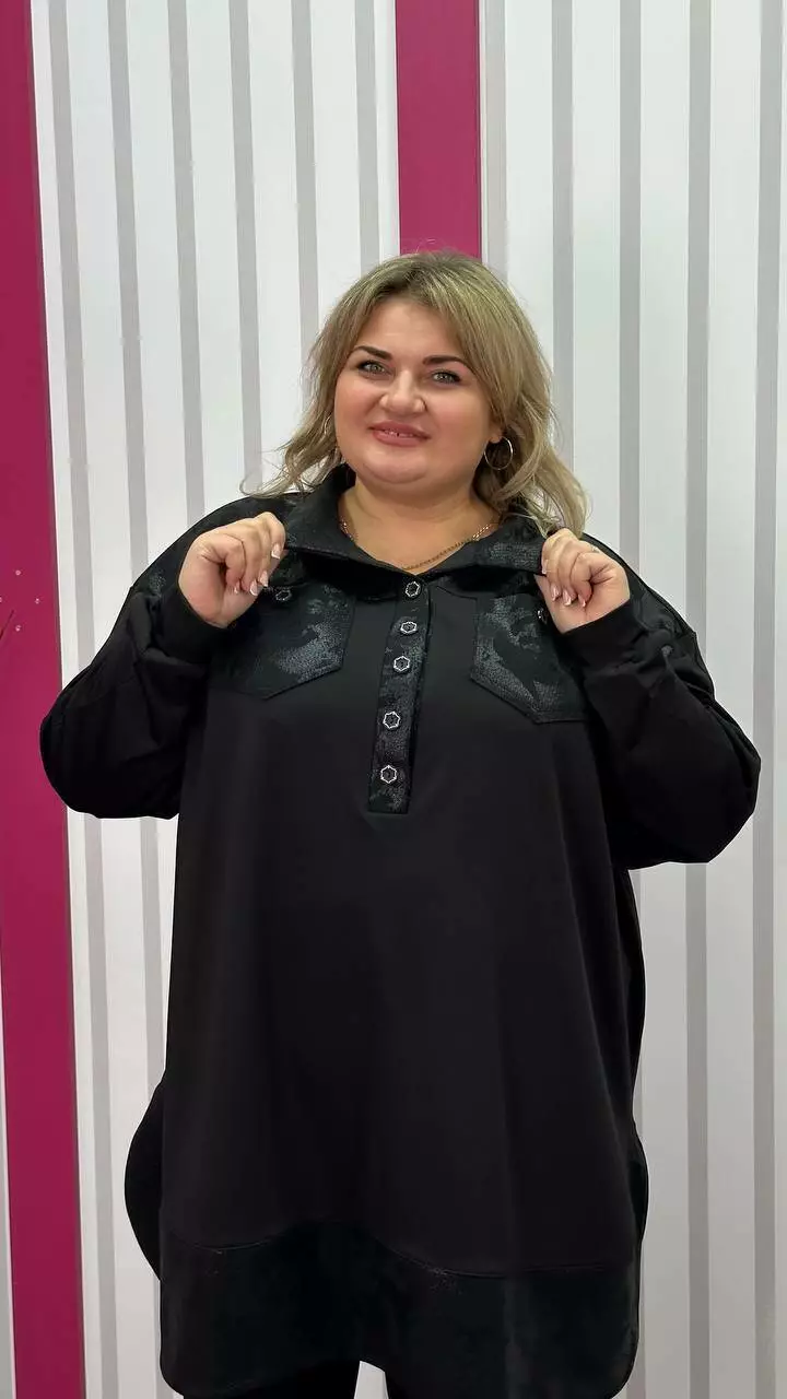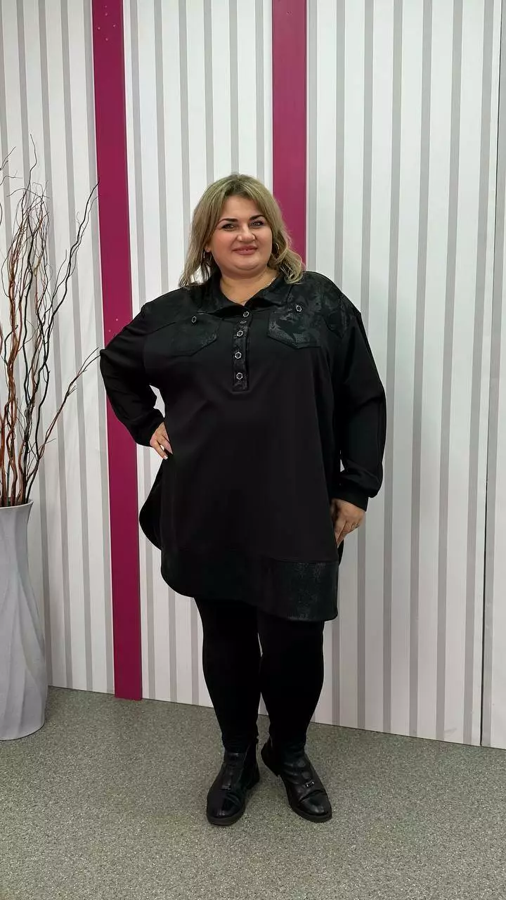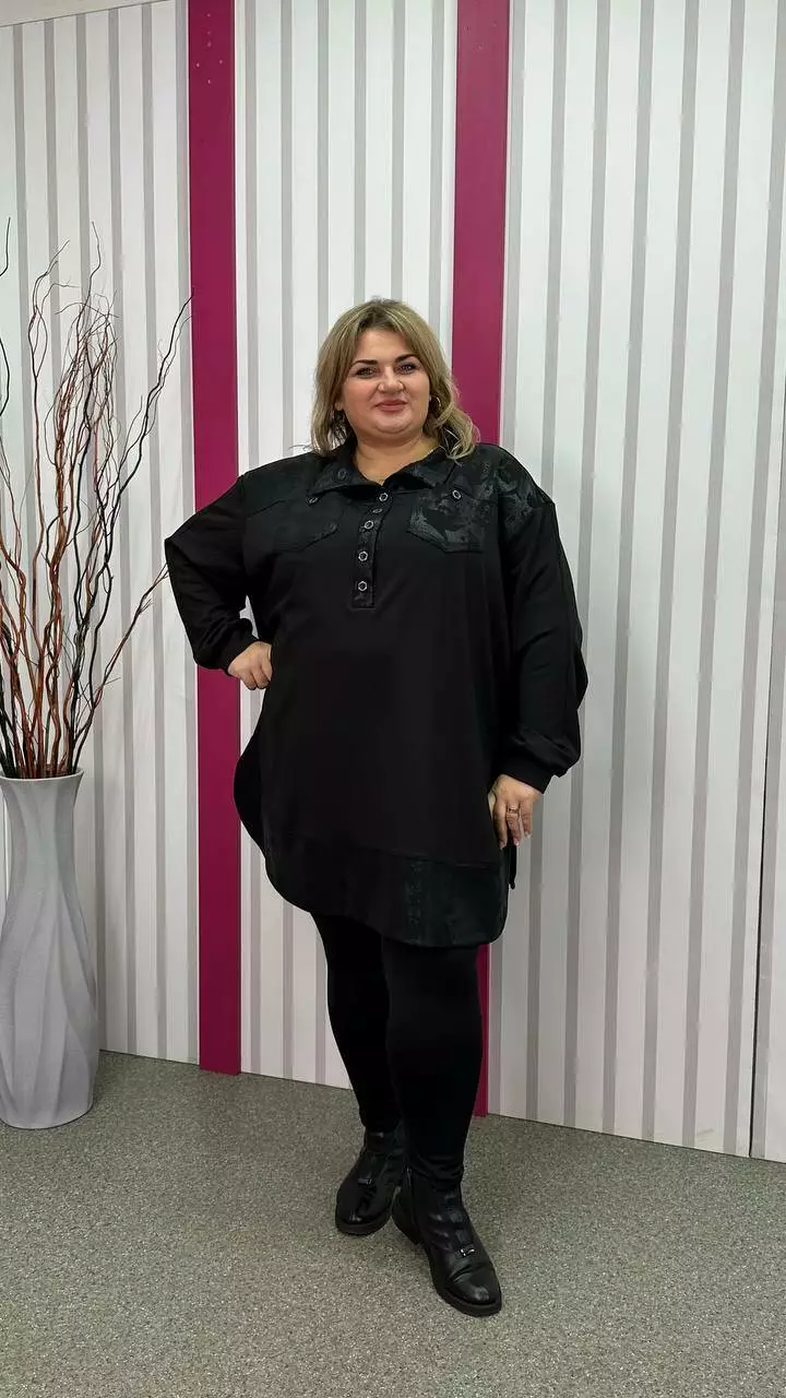Туніка-сорочка з трикотажу мікродайвінг на флісі середньої щільності з гарною розтяжністю, дуже м'яка і приємна до тіла. Силует вільний А-подібний, спущене плече, рукав довгий. Планка декоративна не розтігується. На грудях дві функціональні кишені. Підійде як на кожен день, так і на вихід.