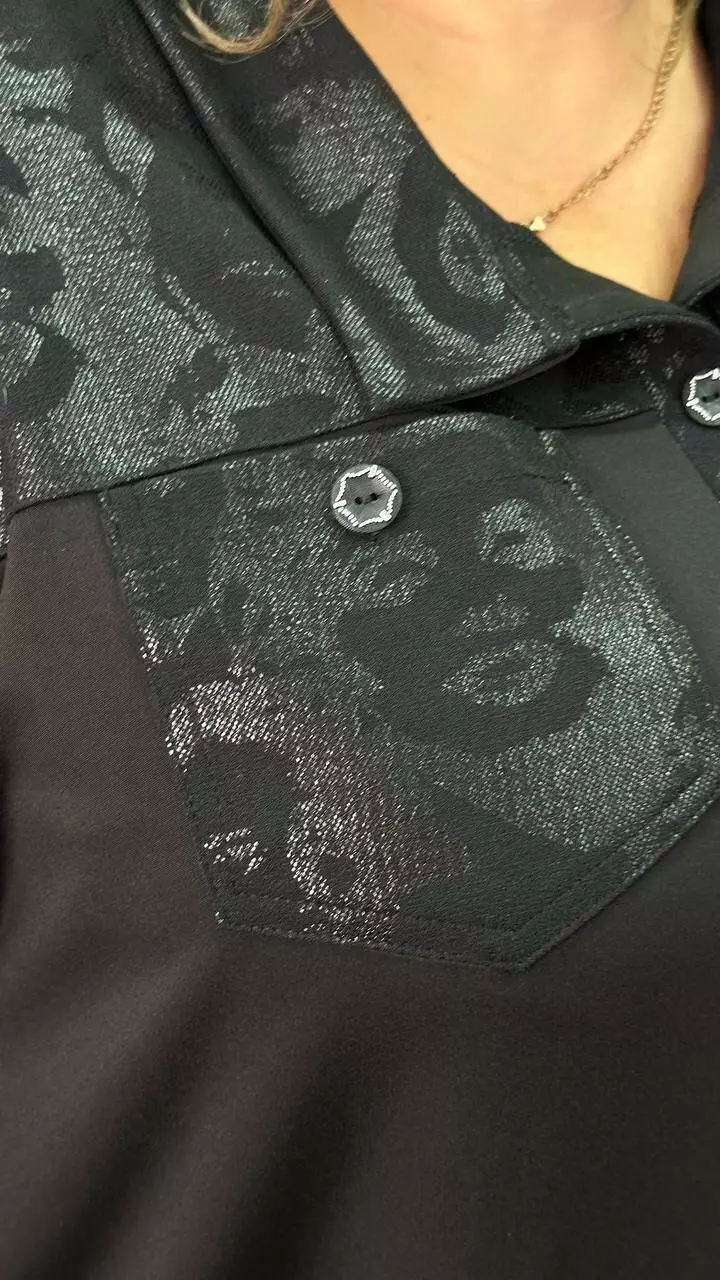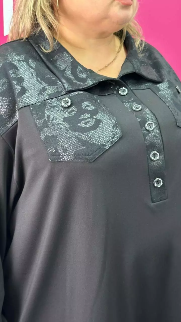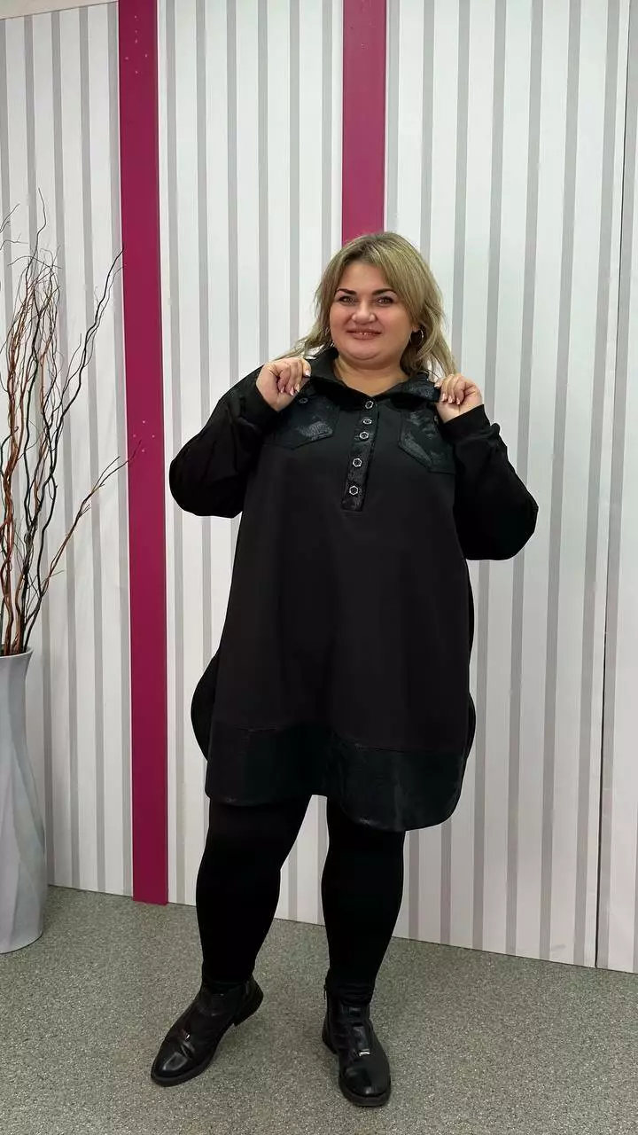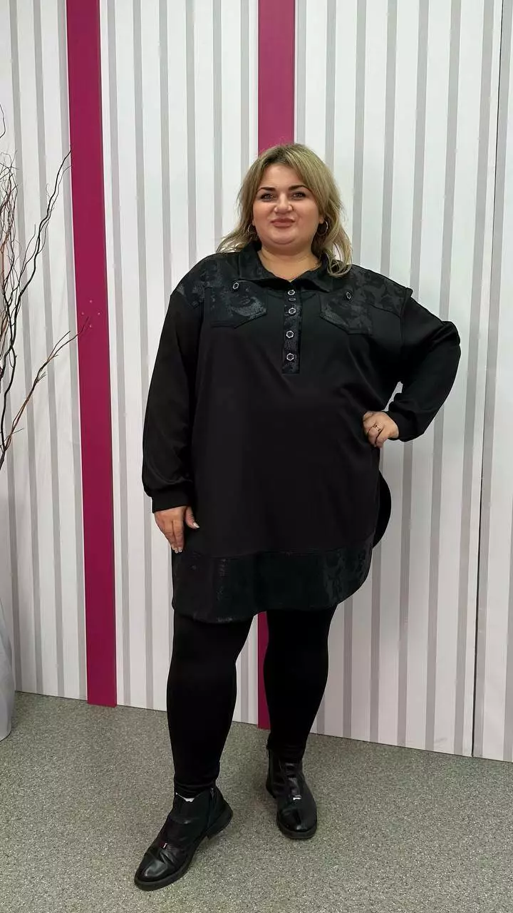 Туніка-сорочка з трикотажу мікродайвінг на флісі середньої щільності з гарною розтяжністю, дуже м'яка і приємна до тіла. Силует вільний А-подібний, спущене плече, рукав довгий. Планка декоративна не розтігується. На грудях дві функціональні кишені. Підійде як на кожен день, так і на вихід.