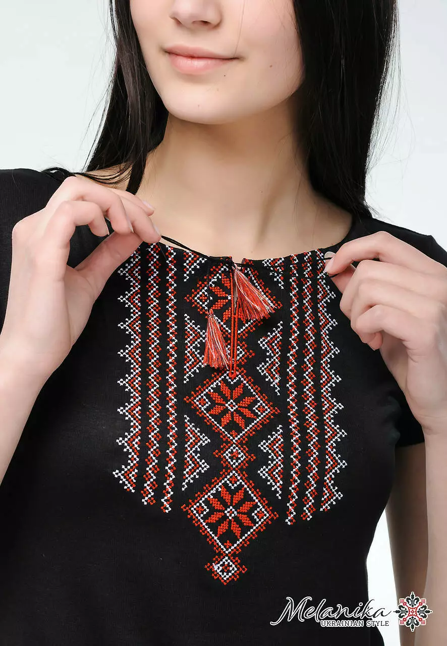 Ця чорна жіноча вишита футболка по-справжньому особлива. Навіть неможливо переоцінити нереальну красу натурального гуцульського орнаменту. Геометрична композиція виконана хрестиком. Нитки вдало підібрані. Червоні яскраві візерунки домінують на чорній основній тканині. Вишивка виконана технікою машинної вишивки. Будьте певні, що кожен стібок надійний та не розійдеться після прання.