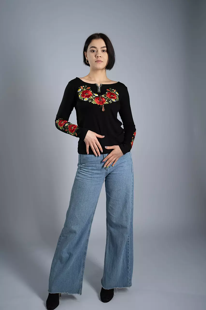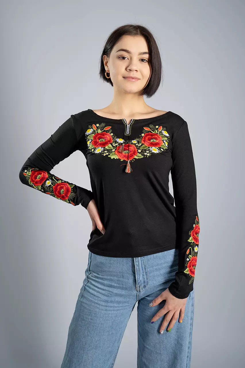 Класика завжди буде у моді. А що може бути більш класичним ніж чорна вишита футболка із квітковим орнаментом. Саме тому ми й створили модель Маковий цвіт. Дана вишиванка щедро прикрашена маками на рукавах та горловині. А доповненна модель завязками, які розміщені на круглій горловині. З їх допомогою ви самі зможете контролювати виріз.