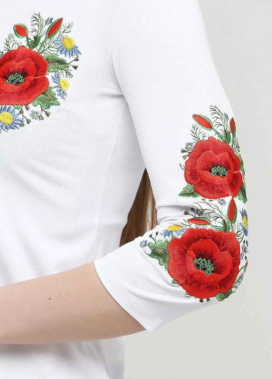 Жіноча вишиванка із рукавом три четвертри "Маків цвіт" - це саме те, що необхідно вашому етно-стилю. Модель виконана у білосніжному білому кольорі за рахунок якого вишивака виглялає більш насиченіше та яскравіше. Вишита футболка прикрашена на грудях трьома великими маками і зеленю. Окрім цього збоку на рукавах розміщена аналогічна вишивка, що і на грудях, але в меншому розмірі.