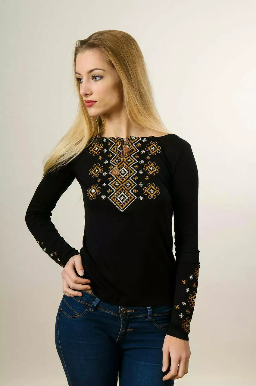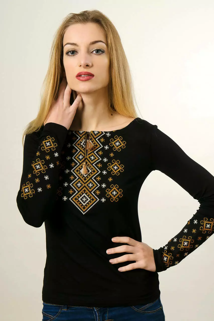 Розкішна жіноча вишита футболка на довгий рукав “Карпатський орнамент” стане Вашою улюбленою. Над її створенням працювала ціла команда стилістів. Вишитий орнамент виконаним поєднанням ниток кількох пастельних тонів: коричневого та сірого. Геометричні композиції, створені на основі стародавніх карпатських орнаментів, прикрашають перед цієї моделі, а також обидва рукави. Ніжні кутасики додають скромності цій моделі.