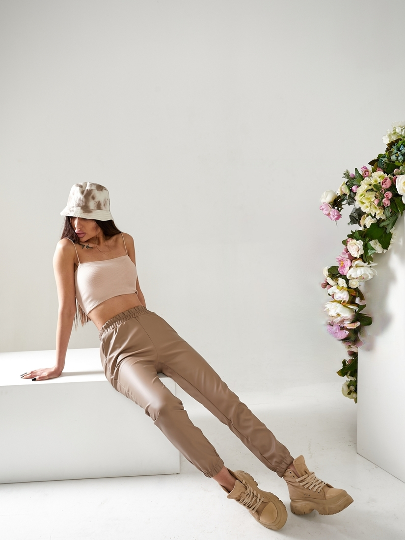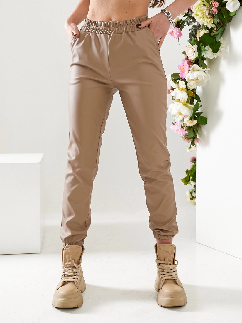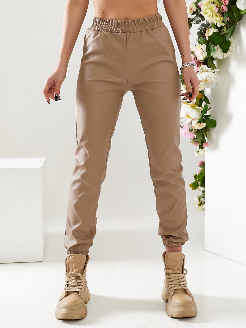 Штани жіночі з якісної екошкіри "Джогери" бежевого кольору
