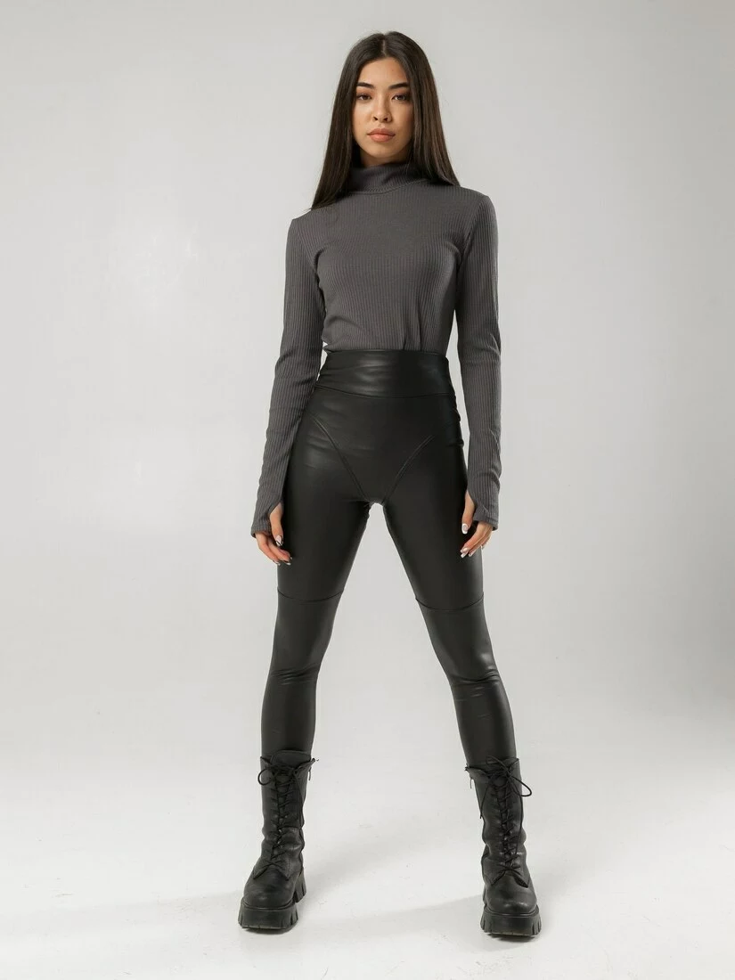 Жіночі лосини з еко - шкіри на велюрі c ефектом ботфортів. Модель з оригінальними декоративними швами візуально підкреслюють сідниці і створюють ефект високого ботфорта. Лосини на високій посадці з припливним поясом. Виготовлені з м'якої і приємної еко - шкіри на велюрі.