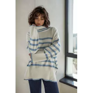 Подовжений светр у смужку має довгі широкі рукави з манжетами, високу горловину та манжет по низу виробу.