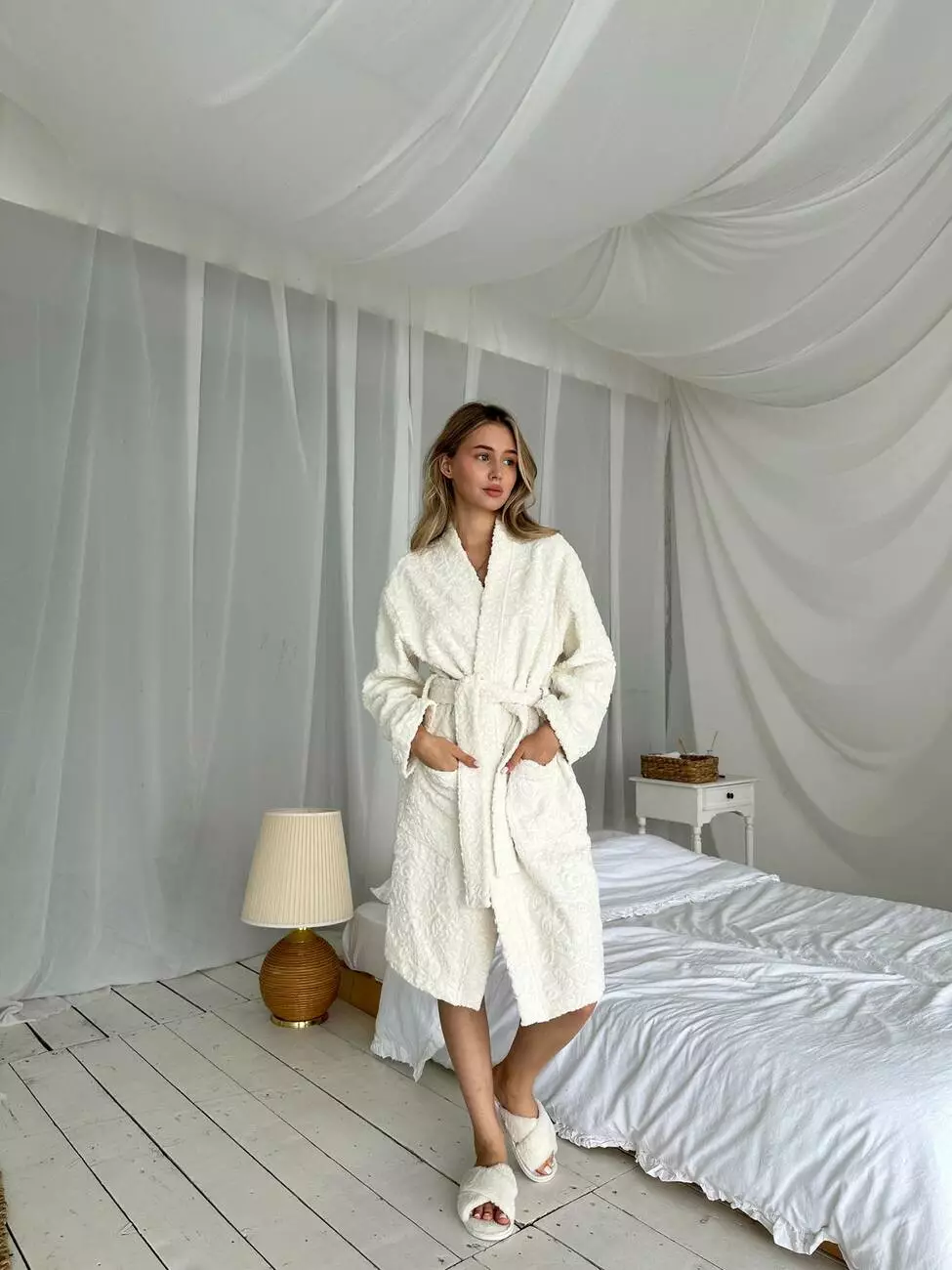Окремої уваги заслуговує витончений жакардовий малюнок, що нагадує чарівні квіти. Ці хитромудрі візерунки не тільки додають текстурної глибини, але й роблять халат справжнім твором мистецтва.