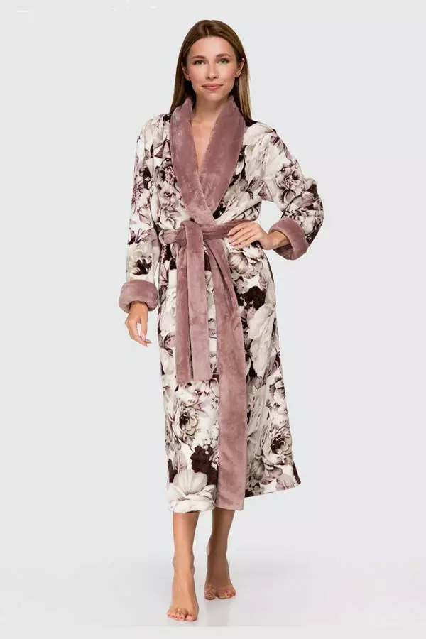 Теплий жіночий халат з плюшевої тканини від German Volf поєднує комфорт і стиль. Виконаний з високоякісного велсофта (100% поліестер), цей халат забезпечує м'якість і зберігає тепло, що робить його ідеальним для прохолодних вечорів. Особливий дизайн із квітковим принтом і контрастним пудровим коміром додає шарму та жіночності.
