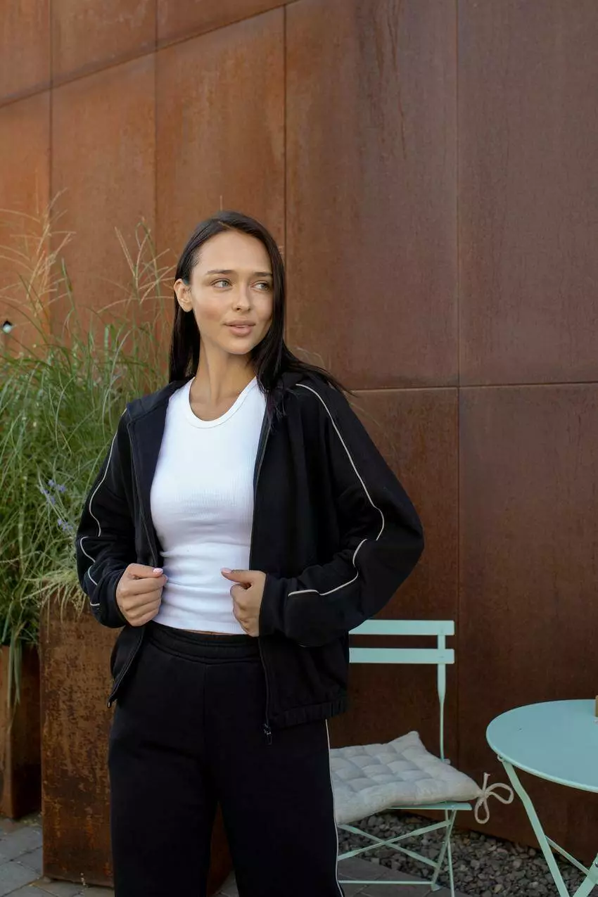 включає худі на замку з капюшоном і штани прямого крою з модними